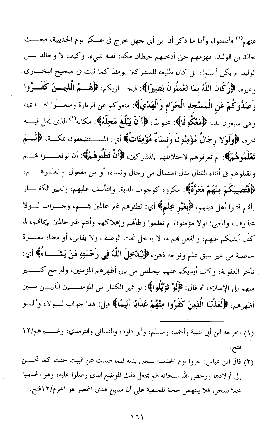 عنهم فأطلقوا، وأما ما ذكر أن ابن أبي جهل خرج في عسكر يوم الحديبية، فبعث خالد بن الوليد، فهزمهم حتى أدخلهم حيطان مكة، ففيه شيء، وكيف لا وخالد بن الوليد لم يكن أسلم!؛ بل كان طليعة للمشركين يومئذ كما ثبت في صحيح البخاري وغيره، (وَكَانَ اللهُ بِمَا تَعْمَلُونَ بَصِيرًا): فيجازيكم، (هُمُ الَّذِينَ كَفَرُوا وَصَدُّوكُمْ عَنِ الْمَسْجِدِ الْحَرَامِ وَالْهَدْيَ): منعوكم عن الزيارة ومنعوا الهدى، وهى سبعون بدنة (مَعْكُوفًا): محبوسًا، (أَنْ يَبْلُغَ مَحِلَّهُ): مكانه الذي يحل فيه نحره، (وَلَوْلَا رِجَالٌ مُؤْمِنُونَ وَنِسَاءٌ مُؤْمِنَاتٌ) أي: المستضعفون بمكة، (لَمْ تَعْلَمُوهُمْ): لم تعرفوهم لاختلاطهم بالمشركين، (أَنْ تَطَئُوهُمْ): أن توقعوا بهم وتقتلوهم في أثناء القتال بدل اشتمال من رجال ونساء، أو من مفعول لم تعلموهم، (فَتُصِيبَكُمْ مِنْهُمْ مَعَرَّةٌ): مكروه كوجوب الدية، والتأسف عليهم، وتعيير الكفار بأنَّهم قتلوا أهل دينهم، (بِغَيْرِ عِلْمٍ) أي: تطئوهم غير عالمين بهم، وجواب لولا محذوف، والمعنى: لولا مؤمنون لم تعلموا وطأتهم وإهلاكهم وأنتم غير عالمين بإيمانهم، لما كفَّ أيديكم عنهم، والفعل بهم ما لا يدخل تحت الوصف ولا يقاس، أو معناه معرة حاصلة من غير سبق علم وتوجه ذهن، (لِيُدْخِلَ اللهُ فِي رَحْمَتِهِ مَنْ يَشَاءُ) أي: (تأخر العقوبة، وكف) أيديكم عنهم ليخلص من بين أظهرهم المؤمنين، وليرجع كثير منهم إلى الإسلام، ثم قال: (لَوْ تَزَيَّلُوا): لو تميز الكفار من المؤمنين الذين بين أظهرهم، (لَعَذَّبْنَا الَّذِينَ كَفَرُوا مِنْهُمْ عَذَابًا أَلِيمًا) قيل: هذا جواب لولا، و " لو