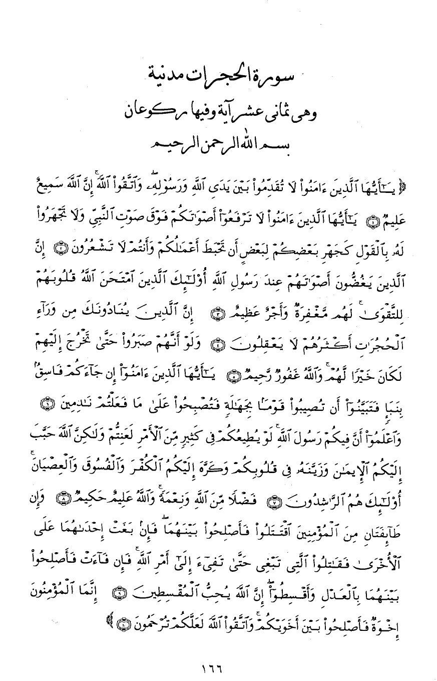 (يَا أَيُّهَا الَّذِينَ آمَنُوا لَا تُقَدِّمُوا بَيْنَ يَدَيِ اللهِ وَرَسُولِهِ وَاتَّقُوا اللهَ إِنَّ اللهَ سَمِيعٌ عَلِيمٌ (1) يَا أَيُّهَا الَّذِينَ آمَنُوا لَا تَرْفَعُوا أَصْوَاتَكُمْ فَوْقَ صَوْتِ النَّبِيِّ وَلَا تَجْهَرُوا لَهُ بِالْقَوْلِ كَجَهْرِ بَعْضِكُمْ لِبَعْضٍ أَنْ تَحْبَطَ أَعْمَالُكُمْ وَأَنْتُمْ لَا تَشْعُرُونَ (2) إِنَّ الَّذِينَ يَغُضُّونَ أَصْوَاتَهُمْ عِنْدَ رَسُولِ اللهِ أُولَئِكَ الَّذِينَ امْتَحَنَ اللهُ قُلُوبَهُمْ لِلتَّقْوَى لَهُمْ مَغْفِرَةٌ وَأَجْرٌ عَظِيمٌ (3) إِنَّ الَّذِينَ يُنَادُونَكَ مِنْ وَرَاءِ الْحُجُرَاتِ أَكْثَرُهُمْ لَا يَعْقِلُونَ (4) وَلَوْ أَنَّهُمْ صَبَرُوا حَتَّى تَخْرُجَ إِلَيْهِمْ لَكَانَ خَيْرًا لَهُمْ وَاللهُ غَفُورٌ رَحِيمٌ (5) يَا أَيُّهَا الَّذِينَ آمَنُوا إِنْ جَاءَكُمْ فَاسِقٌ بِنَبَإٍ فَتَبَيَّنُوا أَنْ تُصِيبُوا قَوْمًا بِجَهَالَةٍ فَتُصْبِحُوا عَلَى مَا فَعَلْتُمْ نَادِمِينَ (6) وَاعْلَمُوا أَنَّ فِيكُمْ رَسُولَ اللهِ لَوْ يُطِيعُكُمْ فِي كَثِيرٍ مِنَ الْأَمْرِ لَعَنِتُّمْ وَلَكِنَّ اللهَ حَبَّبَ إِلَيْكُمُ الْإِيمَانَ وَزَيَّنَهُ فِي قُلُوبِكُمْ وَكَرَّهَ إِلَيْكُمُ الْكُفْرَ وَالْفُسُوقَ وَالْعِصْيَانَ أُولَئِكَ هُمُ الرَّاشِدُونَ (7) فَضْلًا مِنَ اللهِ وَنِعْمَةً وَاللهُ عَلِيمٌ حَكِيمٌ (8) وَإِنْ طَائِفَتَانِ مِنَ الْمُؤْمِنِينَ اقْتَتَلُوا فَأَصْلِحُوا بَيْنَهُمَا فَإِنْ بَغَتْ إِحْدَاهُمَا عَلَى الْأُخْرَى فَقَاتِلُوا الَّتِي تَبْغِي حَتَّى تَفِيءَ إِلَى أَمْرِ اللهِ فَإِنْ فَاءَتْ فَأَصْلِحُوا بَيْنَهُمَا بِالْعَدْلِ وَأَقْسِطُوا إِنَّ اللهَ يُحِبُّ الْمُقْسِطِينَ (9) إِنَّمَا الْمُؤْمِنُونَ إِخْوَةٌ فَأَصْلِحُوا بَيْنَ أَخَوَيْكُمْ وَاتَّقُوا اللهَ لَعَلَّكُمْ تُرْحَمُونَ (10)