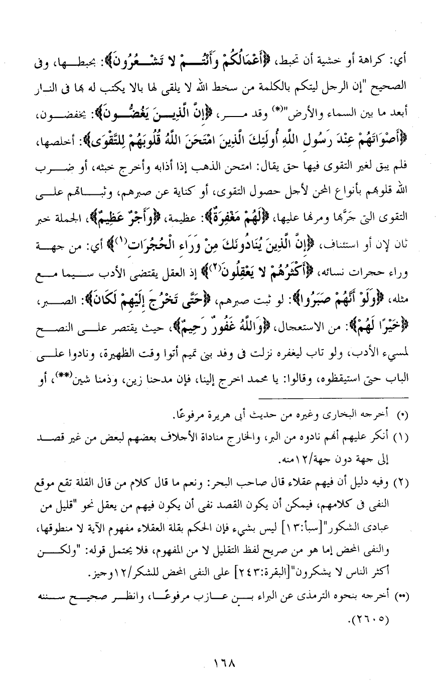 أي: كراهة أو خشية أن تحبط، (أَعْمَالُكُمْ وَأَنْتُمْ لَا تَشْعُرُونَ): بحبطها، وفي الصحيح " إن الرجل ليتكلم بالكلمة من سخط الله لا يلقي لها بالاً يكتب له بها في النار أبعد ما بين السماء والأرض " (1) وقد مر، (إِنَّ الَّذِينَ يَغُضُّونَ): يخفضون، (أَصْوَاتَهُمْ عِنْدَ رَسُولِ اللهِ أُولَئِكَ الَّذِينَ امْتَحَنَ اللهُ قُلُوبَهُمْ لِلتَّقْوَى): أخلصها، فلم يبق لغير التقوى فيها حق يقال: امتحن الذهب إذا أذابه وأخرج خبثه، أو ضرب الله قلوبهم بأنواع المحن لأجل حصول التقوى، أو كناية عن صبرهم، وثباتهم على التقوى التي جَرَّبها ومرنها عليها، (لَهُمْ مَغْفِرَةٌ): عظيمة، (وَأَجْرٌ عَظِيمٌ)، الجملة خبر ثان لـ إنَّ أو استئناف، (إِنَّ الَّذِينَ يُنَادُونَكَ مِنْ وَرَاءِ الْحُجُرَاتِ) أي: من جهة وراء حجرات نسائه (أَكْثَرُهُمْ لا يَعْقلُونَ) إذ العقل يقتضي الأدب سيما مع مثله، (وَلَوْ أَنَّهُمْ صَبَرُوا): لو ثبت صبرهم، (حَتَّى تَخْرُجَ إِلَيْهِمْ لَكَانَ): الصبر، (خَيْرًا لَهُمْ): من الاستعجال، (وَاللهُ عفُورٌ رَحِيمٌ)، حيث يقتصر على النصح لمسيء الأدب، ولو تاب ليغفره نزلت في وفد بني تميم أتوا وقت الظهيرة، ونادوا على الباب حتى استيقظوه، وقالوا: يا محمد اخرج إلينا، فإن مدحنا زين، وذمنا شين، أو