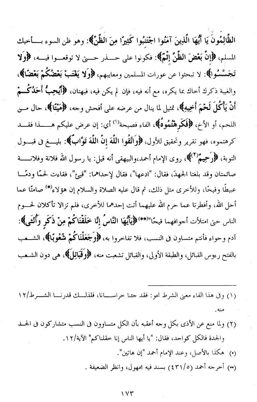 الظَّالِمُونَ يَا أَيُّهَا الَّذِينَ آمَنُوا اجْتَنِبُوا كَثِيرًا مِنَ الظَّنِّ): وهو ظن السوء بأخيك المسلم، (إِنَّ بَعْضَ الظَّنِّ إِثْمٌ): فكونوا على حذر حتى لا توقعوا فيه، (وَلَا تَجَسَّسُوا): لا تبحثوا عن عورات المسلمين ومعايبهم، (وَلَا يَغْتَبْ بَعْضُكُمْ بَعْضًا)، والغيبة ذكرك أخاك بما يكره، مع أنه فيه، فإن لم يكن فيه، فبهتان، (أَيُحِبُّ أَحَدُكُمْ أَنْ يَأْكُلَ لَحْمَ أَخِيهِ)، تمثيل لما ينال من عرضه على أفحش وجه، (مَيْتًا)، حال من اللحم، أو الأخ، (فَكَرِهْتُمُوهُ)، الفاء فصيحة أي: إن عرض عليكم هذا فقد كرهتموه، فهو تقرير وتحقيق للأول، (وَاتَّقُوا اللهَ إِنَّ اللهَ تَوَّابٌ): بليغ في قبول التوبة، (رَحِيمٌ)، روى الإمام أحمد، والبيهقي أنه قيل: يا رسول الله فلانة وفلانة صائمتان وقد بلغتا الجهدَ، فقال: " ادعها "، فقال لإحداهما: " قيئي "، فقاءت لحمًا ودمًا عبيطًا وقيحًا، وللأخرى مثل ذلك، ثم قال عليه الصلاة والسلام إن هؤلاء صامتًا عما أحل الله، وأفطرتا عما حرم الله عليهما أتت إحدهما للأخرى، فلم تزالا تأكلان لحوم الناس حتى امتلأت أجوافهما قيحًا (يَا أَيُّهَا النَّاسُ إِنَّا خَلَقْنَاكُمْ مِنْ ذَكَرٍ وَأُنْثَى): آدم وحواء فأنتم متساون في النسب، فلا تفاخروا به، (وَجَعَلْنَاكُمْ شُعُوبًا)، الشعب بالفتح رءوس القبائل، والطبقة الأولى، والقبائل تشعبت منه، (وَقَبَائِلَ)، هي دون الشعب