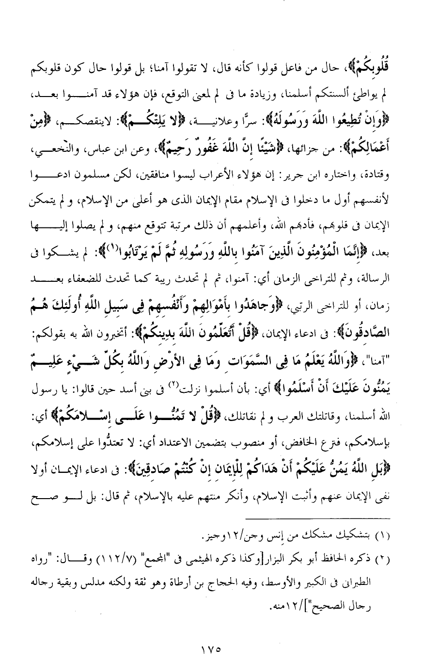 قُلُوبِكُمْ)، حال من فاعل قولوا كأنه قال، لا تقولوا آمنا؛ بل قولوا حال كون قلوبكم لم يواطئ ألسنتكم أسلمنا، وزيادة ما في المعنى التوقع، فإن هؤلاء قد آمنوا بعد، (وَإِنْ تُطِيعُوا اللهَ وَرَسُولَهُ): سرًّا وعلانية، (لَا يَلِتْكُمْ): لا ينقصكم، (مِنْ أَعْمَالِكُمْ): من جزائها، (شَيْئًا إِنَّ اللهَ غَفُورٌ رَحِيمٌ)، وعن ابن عباس، والنخعي، وقتادة، واختاره ابن جرير: إن هؤلاء الأعراب ليسوا منافقين، لكن مسلمون ادعوا لأنفسهم أول ما دخلوا في الإسلام مقام الإيمان الذي هو أعلى من الإسلام، ولم يتمكن الإيمان في قلوبهم، فأدبهم الله، وأعلمهم أن ذلك مرتبة تتوقع منهم، ولم يصلوا إليها بعد، (إِنَّمَا الْمُؤْمِنُونَ الَّذِينَ آمَنُوا بِاللهِ وَرَسُولِهِ ثُمَّ لَمْ يَرْتَابُوا): لم يشكوا في الرسالة، وثم للتراخي الزماني أي: آمنوا، ثم لم تحدث ريبة كما تحدث للضعفاء بعد زمان، أو للتراخي الرتبي، (وَجَاهَدُوا بِأَمْوَالِهِمْ وَأَنْفُسِهِمْ فِي سَبِيلِ اللهِ أُولَئِكَ هُمُ الصَّادِقُونَ): في ادعاء الإيمان، (قُلْ أَتُعَلِّمُونَ اللهَ بِدِينِكُمْ): أتخبرون الله به بقولكم: " آمنا "، (وَاللهُ يَعْلَمُ مَا فِي السَّمَاوَاتِ وَمَا فِي الْأَرْضِ وَاللهُ بِكُلِّ شَيْءٍ عَلِيمٌ يَمُنُّونَ عَلَيْكَ أَنْ أَسْلَمُوا) أي: بأن أسلموا نزلت في بني أسد حين قالوا: يا رسول الله أسلمنا، وقاتلتك العرب ولم نقاتلك، (قُلْ لَا تَمُنُّوا عَلَيَّ إِسْلَامَكُمْ) أي: بإسلامكم، فنزع الخافض، أو منصوب بتضمين الاعتداد أي: لا [تعدُّوا] عليَّ إسلامكم، (بَلِ اللهُ يَمُنُّ عَلَيْكُمْ أَنْ هَدَاكُمْ لِلْإِيمَانِ إِنْ كُنْتُمْ صَادِقِينَ): في ادعاء الإيمان أولاً نفى الإيمان عنهم وأثبت الإسلام، وأنكر منَّتهم عليه بالإسلام، ثم قال: بل لو صح