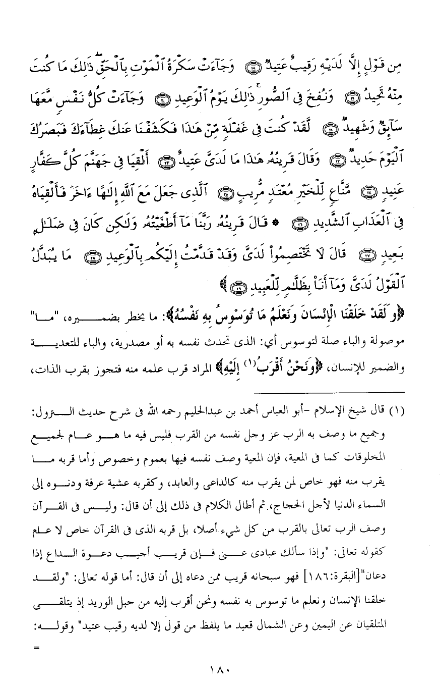 (وَلَقَدْ خَلَقْنَا الْإِنْسَانَ وَنَعْلَمُ مَا تُوَسْوِسُ بِهِ نَفْسُهُ): ما يخطر بضميره، " ما " موصولة والباء صلة لـ توسوس أي: الذي تحدث نفسه به أو مصدرية، والباء للتعدية والضمير للإنسان، (وَنَحْنُ أَقْرَبُ إِلَيْهِ) المراد قرب علمه منه فتجوز بقرب الذات،