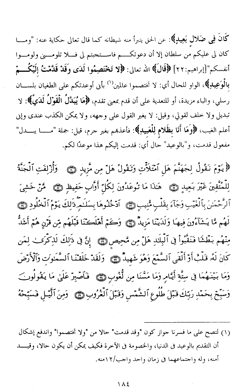 كَانَ فِي ضَلَالٍ بَعِيدٍ): عن الحق يتبرأ منه شيطانه كما قال تعالى حكاية عنه: (وَمَا كَانَ لِيَ عَلَيْكُمْ مِنْ سُلْطَانٍ إِلَّا أَنْ دَعَوْتُكُمْ فَاسْتَجَبْتُمْ لِي فَلَا تَلُومُونِي وَلُومُوا أَنْفُسَكُمْ) [إبراهيم: 22] (قَالَ) الله تعالى: (لَا تَخْتَصِمُوا لَدَيَّ وَقَدْ قَدَّمْتُ إِلَيْكُمْ بِالْوَعِيدِ)، الواو للحال أي: لا تختصموا عالمين بأني أوعدتكم على الطغيان بلسان رسلي، والباء مزيدة، أو للتعدية على أن قدم بمعنى تقدم، (مَا يُبَدَّلُ الْقَوْلُ لَدَيَّ): لا تبديل ولا خلف لقولي، وقيل: لا يغير القول على وجهه، ولا يمكن الكذب عندي وإني أعلم الغيب، (وَمَا أَنَا بِظَلَّامٍ لِلْعَبِيدِ)؛ فأعذبهم بغير جرم، قيل: جملة " ما يبدل " مفعول قدمت، و " بالوعيد " حال أي: قدمت إليكم هذا موعدًا لكم.