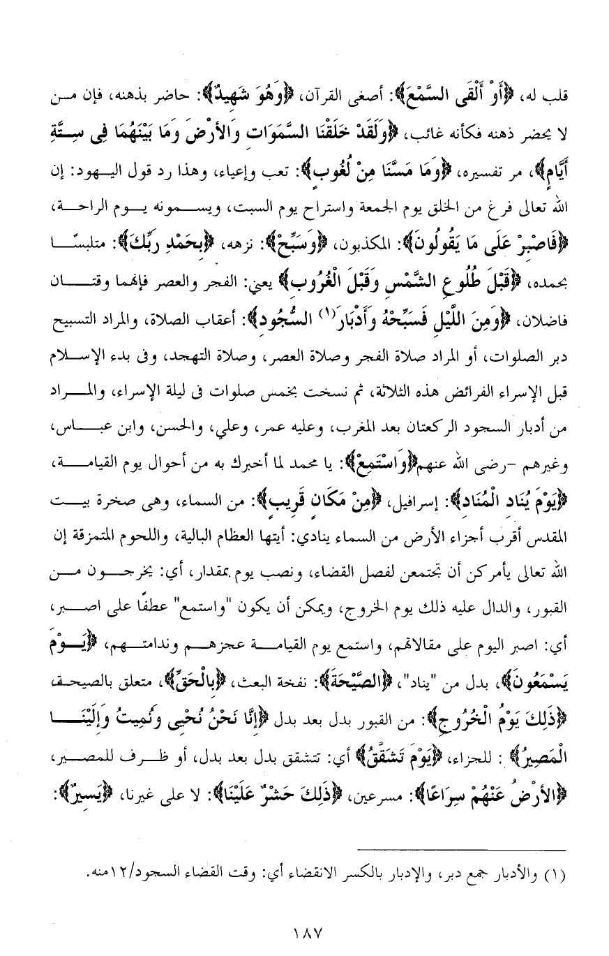 لا قلب له، (أَوْ أَلْقَى السَّمْعَ): أصغى [للقرآن]، (وَهُوَ شَهِيدٌ): حاضر بذهنه، فإن من لا يحضر ذهنه فكأنه غائب، (وَلَقَدْ خَلَقْنَا السَّمَاوَاتِ وَالْأَرْضَ وَمَا بَيْنَهُمَا فِي سِتَّةِ أَيَّامٍ)، مر تفسيره، (وَمَا مَسَّنَا مِنْ لُغُوبٍ): تعب وإعياء، وهذا رد قول اليهود: إن الله تعالى فرغ من الخلق يوم الجمعة واستراح يوم السبت، ويسمونه يوم الراحة، (فَاصْبرْ عَلَى مَا يَقُولُونَ): المكذبون، (وَسَبِّحْ): نزهه، (بِحَمْدِ ربِّكَ): متلبسًا بحمده، (قَبْلَ طُلُوعِ الشَّمْسِ وَقَبْلَ الْغُرُوبِ) يعني: الفجر والعصر فإنهما وقتان فاضلان، (وَمِنَ اللَّيْلِ فَسَبِّحْهُ وَأَدْبَارَ السُّجُودِ): أعقاب الصلاة، والمراد التسبيح دبر الصلوات، أو المراد صلاة الفجر وصلاة العصر، وصلاة التهجد، وفي بدء الإسلام قبل الإسراء الفرائض هذه الثلاثة، ثم نسخت بخمس صلوات في ليلة الإسراء، والمراد من أدبار السجود الركعتان بعد المغرب، وعليه عمر، وعلي، والحسن، وابن عباس، وغيرهم - رضي الله عنهم (وَاسْتَمِعْ): يا محمد لما أخبرك به من أحوال يوم القيامة، (يَوْمَ يُنَادِ الْمُنَادِ): إسرافيل، (مِنْ مَكَانٍ قَرِيبٍ): من السماء، وهي صخرة بيت المقدس أقرب أجزاء الأرض من السماء ينادي: أيتها العظام البالية، واللحوم المتمزقة إن الله تعالى يأمركن أن تجتمعن لفصل القضاء، ونصب يوم بمقدار، أي: يخرجون من القبور، والدال عليه ذلك يوم الخروج، ويمكن أن يكون " واستمع " عطفًا على اصبر، أي: اصبر اليوم على مقالاتهم، واستمع يوم القيامة عجزهم وندامتهم، (يَوْمَ يَسْمَعون)، بدل من " يناد "، (الصَّيْحَةَ): نفخة البعث، (بِالْحَقِّ)، متعلق بالصيحة، (ذَلِكَ يَوْمُ الْخُرُوجِ): من القبور بدل بعد بدل (إِنَّا نَحْنُ نُحْيِي وَنُمِيتُ وَإِلَيْنَا الْمَصِيرُ): للجزاء، (يَوْمَ تَشَقَّقُ) أي: تتشقق بدل بعد بدل، أو ظرف للمصير، (الأرْضُ عَنْهُمْ سِرَاعًا): مسرعين، (ذَلِكَ حَشْرٌ عَلَيْنا): لا على غيرنا، (يَسِيرٌ):