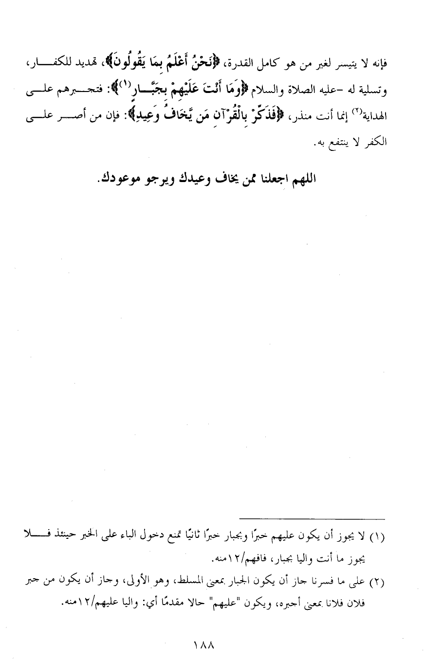 فإنه لا يتيسر لغير من هو كامل القدرة، (نَحْنُ أَعْلَمُ بِمَا يَقُولُونَ)، تهديد للكفار، وتسلية له - عليه الصلاة والسلام (وَمَا أَنْتَ عَلَيْهِمْ بِجَبَّارٍ): فتجبرهم على الهداية إنما أنت منذر، (فَذَكِّرْ بِالْقُرْآنِ مَنْ يَخَافُ وَعِيدِ): فإن من أصرَّ على الكفر لا ينتفع به.