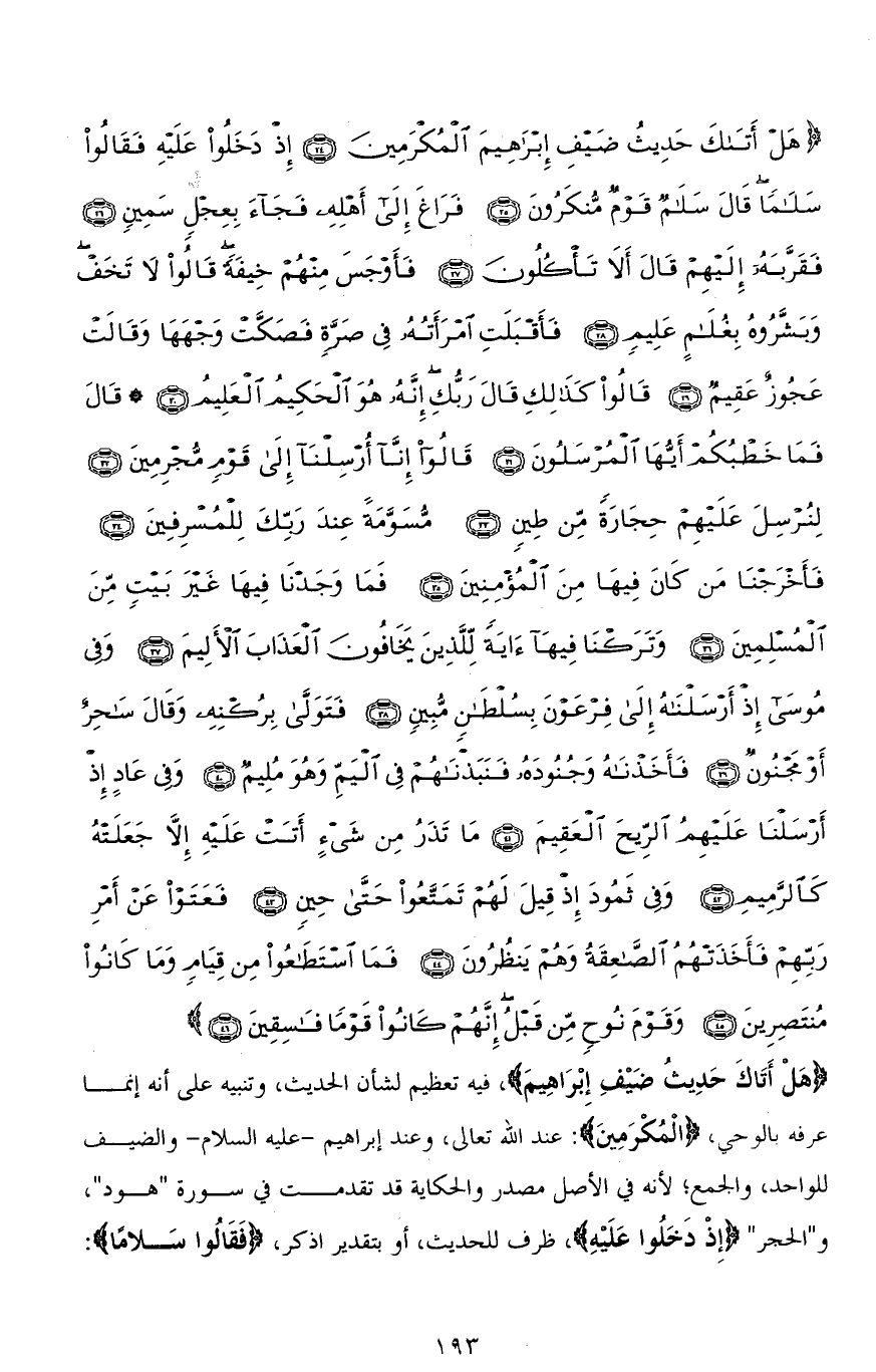 (هَلْ أَتَاكَ حَدِيثُ ضَيْفِ إِبْرَاهِيمَ الْمُكْرَمِينَ (24) إِذْ دَخَلُوا عَلَيْهِ فَقَالُوا سَلَامًا قَالَ سَلَامٌ قَوْمٌ مُنْكَرُونَ (25) فَرَاغَ إِلَى أَهْلِهِ فَجَاءَ بِعِجْلٍ سَمِينٍ (26) فَقَرَّبَهُ إِلَيْهِمْ قَالَ أَلَا تَأْكُلُونَ (27) فَأَوْجَسَ مِنْهُمْ خِيفَةً قَالُوا لَا تَخَفْ وَبَشَّرُوهُ بِغُلَامٍ عَلِيمٍ (28) فَأَقْبَلَتِ امْرَأَتُهُ فِي صَرَّةٍ فَصَكَّتْ وَجْهَهَا وَقَالَتْ عَجُوزٌ عَقِيمٌ (29) قَالُوا كَذَلِكِ قَالَ رَبُّكِ إِنَّهُ هُوَ الْحَكِيمُ الْعَلِيمُ (30) قَالَ فَمَا خَطْبُكُمْ أَيُّهَا الْمُرْسَلُونَ (31) قَالُوا إِنَّا أُرْسِلْنَا إِلَى قَوْمٍ مُجْرِمِينَ (32) لِنُرْسِلَ عَلَيْهِمْ حِجَارَةً مِنْ طِينٍ (33) مُسَوَّمَةً عِنْدَ رَبِّكَ لِلْمُسْرِفِينَ (34) فَأَخْرَجْنَا مَنْ كَانَ فِيهَا مِنَ الْمُؤْمِنِينَ (35) فَمَا وَجَدْنَا فِيهَا غَيْرَ بَيْتٍ مِنَ الْمُسْلِمِينَ (36) وَتَرَكْنَا فِيهَا آيَةً لِلَّذِينَ يَخَافُونَ الْعَذَابَ الْأَلِيمَ (37) وَفِي مُوسَى إِذْ أَرْسَلْنَاهُ إِلَى فِرْعَوْنَ بِسُلْطَانٍ مُبِينٍ (38) فَتَوَلَّى بِرُكْنِهِ وَقَالَ سَاحِرٌ أَوْ مَجْنُونٌ (39) فَأَخَذْنَاهُ وَجُنُودَهُ فَنَبَذْنَاهُمْ فِي الْيَمِّ وَهُوَ مُلِيمٌ (40) وَفِي عَادٍ إِذْ أَرْسَلْنَا عَلَيْهِمُ الرِّيحَ الْعَقِيمَ (41) مَا تَذَرُ مِنْ شَيْءٍ أَتَتْ عَلَيْهِ إِلَّا جَعَلَتْهُ كَالرَّمِيمِ (42) وَفِي ثَمُودَ إِذْ قِيلَ لَهُمْ تَمَتَّعُوا حَتَّى حِينٍ (43) فَعَتَوْا عَنْ أَمْرِ رَبِّهِمْ فَأَخَذَتْهُمُ الصَّاعِقَةُ وَهُمْ يَنْظُرُونَ (44) فَمَا اسْتَطَاعُوا مِنْ قِيَامٍ وَمَا كَانُوا مُنْتَصِرِينَ (45) وَقَوْمَ نُوحٍ مِنْ قَبْلُ إِنَّهُمْ كَانُوا قَوْمًا فَاسِقِينَ (46)