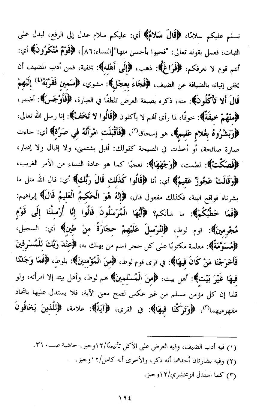 نسلم عليكم سلامًا، (قَالَ سَلامٌ) أي: عليكم سلام عدل إلى الرفع، ليدل على الثبات، فعمل بقوله تعالى: (فحيوا بأحسن منها) [النساء: 86]، (قَوْمٌ مُنْكَرُونَ) أي: أنتم قوم لا نعرفكم، (فرَاغَ): ذهب، (إِلَى أَهْله): بخفية، فمن أدب المضيف أن يخفي إتيانه بالضيافة عن الضيف، (فَجَاءَ بِعِجْلٍ) مَشوي، (سَمينٍ فَقَرَّبَهُ إِلَيْهِمْ قَالَ أَلَا تَأْكُلُونَ): منه، ذكره بصيغة العرض تلطفًا في العبارة، (فأَوْجَسَ): أضمر، (مِنْهُمْ خِيفَةً): خوفًا، لما رأى أنَّهم لا يأكلون (قَالُوا لا تَخَفْ): إنا رسل الله تعالى، (وَبَشَّرُوهُ بِغُلامٍ عَلِيمٍ)، هو إسحاق، (فَأَقْبَلَتِ امْرَأَتُهُ فِي صَرَّةٍ) أي: جاءت صارة صائحة، أو أخذت في الصيحة كقولك: أقبل يشتمني، ولا إقبال ولا إدبار، ْ (فَصَكَّتْ): لطمت، (وَجْهَهَا): تعجبًا كما هو عادة النساء من الأمر الغريب، (وَقَالَتْ عَجُوزٌ عَقِيمٌ) أي: أنا (قَالُوا كَذَلِكِ قَالَ ربُّكِ) أي: قال الله مثل ما بشرناه فواقع ألبتَّة، فكذلك مفعول قال، (إِنَّهُ هُوَ الْحَكِيمُ الْعَلِيمُ قَالَ) إبراهيم: (فَمَا خَطْبُكُمْ): ما شأنكم؟ (أَيُّهَا الْمُرْسَلُونَ قَالُوا إِنَّا أُرْسِلْنَا إِلَى قَوْمٍ مُجْرِمِينَ): قوم لوطِ، (لِنُرْسِلَ عَلَيْهِمْ حِجَارَةً مِنْ طينٍ) أي: السجيل، (مُسَوَّمَةً): معلمة مكتوبًا على كل حجر اسم من يهلك به، (عنْدَ رَبِّكَ لِلْمُسْرِفِينَ فَأَخْرَجْنَا مَنْ كَانَ فِيهَا): في قرى قوم لوط، (مِنَ الْمُؤْمِنِينَ): بلوطٍ، (فَمَا وَجَدْنا فِيهَا غَيْرَ بَيْتٍ): أهل بيت، (مِنَ الْمُسْلِمِينَ) هم لوط، وأهل بيته إلا امرأته، ولو قلنا إن كل مؤمن مسلم من غير عكس لصح معنى الآية، فلا يستدل عليها باتحاد مفهوميهما، (وَتَرَكْنَا فِيهَا): في القرى، (آيَةً): علامة، (لِلَّذِينَ يَخَافُونَ