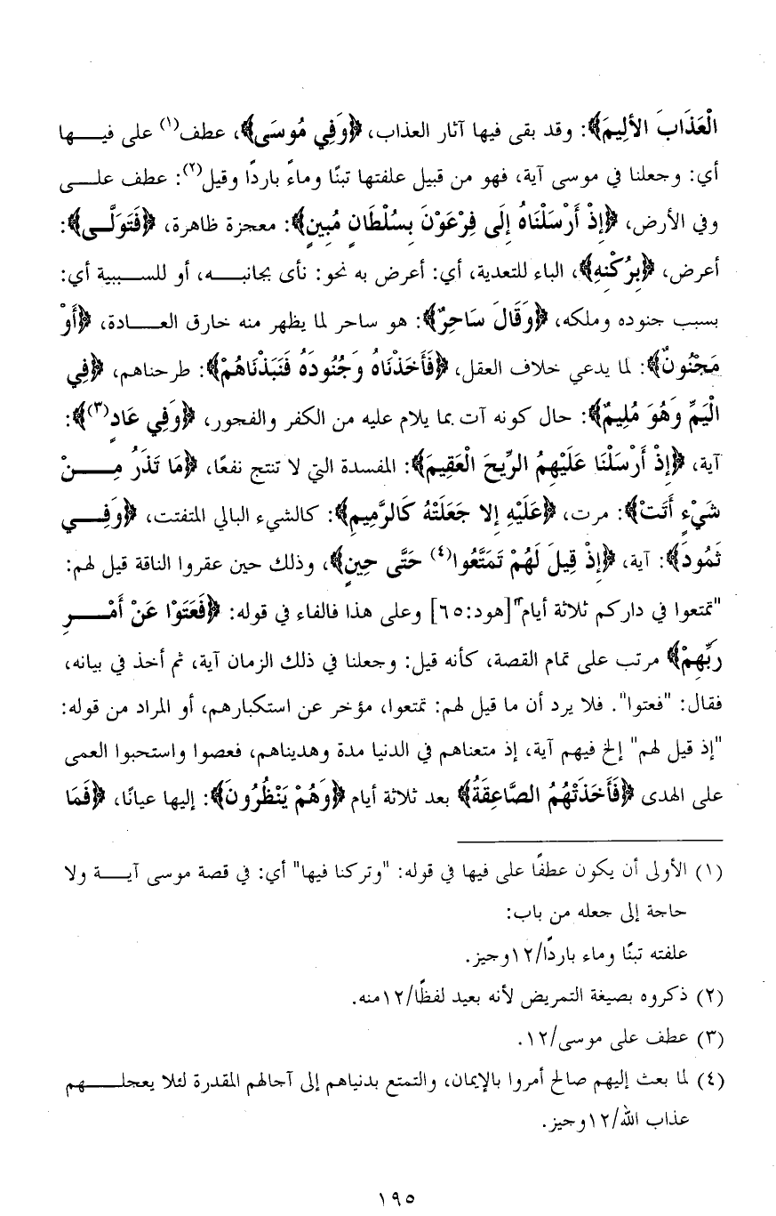 الْعَذَابَ الْأَلِيمَ): وقد بقي فيها آثار العذاب، (وَفِي مُوسَى)، عطف على فيها أي: وجعلنا في موسى آية، فهو من قبيل علفتها تبنًا وماءً باردًا وقيل: عطف على وفي الأرض، (إِذْ أَرْسَلْنَاهُ إِلَى فِرْعَوْنَ بِسُلْطَانٍ مُبِينٍ): معجزة ظاهرة، (فَتَوَلَّى): أعرض، (بِرُكْنِهِ)، الباء للتعدية، أي: أعرض به نحو: نأى بجانبه، أو للسببية أي: بسبب جنوده وملكه، (وَقَالَ سَاحِرٌ): هو ساحر لما يظهر منه خارق العادة، (أَوْ مَجنونٌ): لما يدعي خلاف العقل، (فَأَخَذْنَاهُ وَجُنُودَهُ فَنَبَذْنَاهُمْ): طرحناهم، (فِي الْيَمِّ وَهُوَ مُلِيمٌ): حال كونه آت بما يلام عليه من الكفر والفجور، (وَفِي عَادٍ): آية، (إِذْ أَرْسَلْنَا عَلَيْهِمُ الرّيحَ الْعَقِيمَ): المفسدة التي لا تنتج نفعًا، (مَا تَذَرُ مِن شَيْءٍ أَتَتْ): مرت، (عَلَيْهِ إِلا جَعَلَتْهُ كَالرَّمِيمِ): كالشيء البالي المتفتت، (وَفِي ثَمُودً): آية، (إِذْ قِيلَ لَهُمْ تَمَتَّعُوا حَتَّى حِينٍ)، وذلك حين عقروا الناقة قيل لهم: (تمتعوا في داركم ثلاثة أيام) [هود: 65] وعلى هذا فالفاء في قوله: (فَعَتَوْا عَنْ أَمْر ربِّهِمْ) مرتب على تمام القصة، كأنه قيل: وجعلنا فِي ذلك الزمان آية، ثم أخذ في بيانه، فقال: (فعتوا). فلا يرد أن ما قيل لهم: تمتعوا، مؤخر عن استكبارهم، أو المراد من قوله: " إذ قيل لهم " إلخ فيهم آية، إذ متعناهم في الدنيا مدة وهديناهم، فعصوا واستحبوا العمى على الهدى (فَأَخَذَتْهُمُ الصَّاعِقَةُ) بعد ثلاثة أيام (وَهُمْ يَنْظُرُونَ): إليها عيانًا، (فَمَا