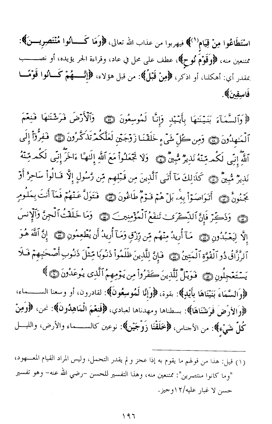 (وَالسَّمَاءَ بَنَيْنَاهَا بِأَيْدٍ): بقوة، (وَإِنَّا لَمُوسِعُونَ): لقادرون، أو وسعنا السماء، (وَالْأَرْضَ فَرَشْنَاهَا): بسطناها ومهدناها لعبادي، (فَنِعْمَ الْمَاهِدُونَ): نحن، (وَمِنْ كُلِّ شَيْءٍ): من الأجناس، (خَلَقْنَا زَوْجَيْنِ): نوعين كالسماء والأرض، والليل