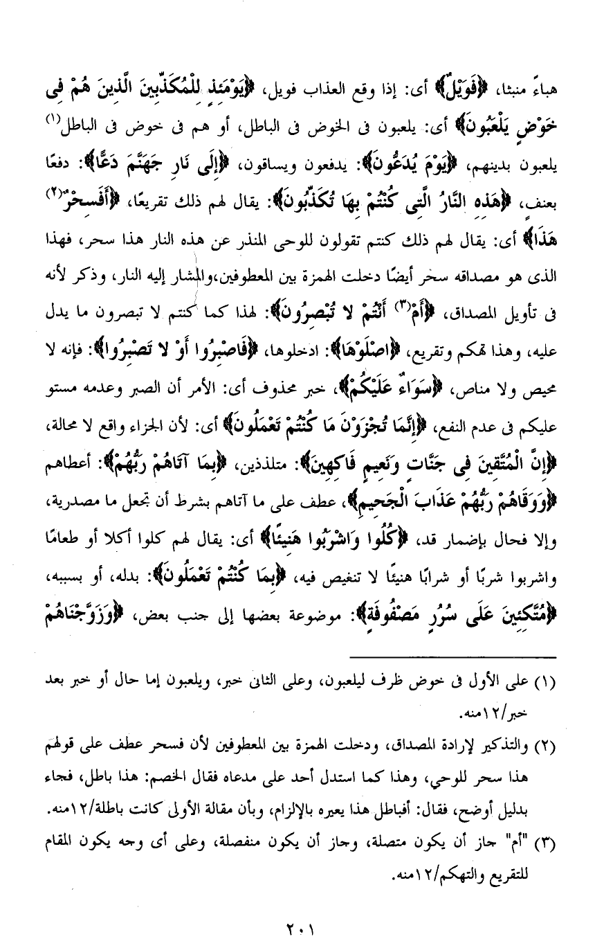 هباءً منبثا، (فَوَيْلٌ) أي: إذا وقع العذاب فويل، (يَوْمَئِذٍ لِلْمُكَذِّبِينَ الَّذِينَ هُمْ فِي خَوْضٍ يَلْعَبُونَ) أي: يلعبون في الخوض في الباطل، أو هم في خوض في الباطل يلعبون بدينهم، (يَوْمَ يُدَعُّونَ): يدفعون ويساقون، (إِلَى نَارِ جَهَنَّمَ دَعًّا): دفعًا بعنف، (هَذِهِ النَّارُ الَّتِي كُنْتُمْ بِهَا تُكَذِّبُونَ): يقال لهم ذلك تقريعًا، (أَفَسِحْرٌ هذَا) أي: يقال لهم ذلك كنتم تقولون للوحي المنذر عن هذه النار هذا سحر، فهذا الذي هو مصداقه سحر أيضًا دخلت الهمزة بين المعطوفين، والمشار إليه النار، وذكر لأنه فى تأويل المصداق، (أَمْ أَنْتُمْ لَا تُبْصِرُونَ): لهذا كما كنتم لا تبصرون ما يدل عليه، وهذا تهكم وتقريع، (اصْلَوْهَا): ادخلوها، (فَاصْبِرُوا أَوْ لَا تَصْبِرُوا): فإنه لا محيص ولا مناص، (سَوَاءٌ عَلَيْكُمْ)، خبر محذوف أي: الأمر أن الصبر وعدمه مستو عليكم في عدم النفع، (إِنَّمَا تُجْزَوْنَ مَا كُنْتُمْ تَعْمَلُونَ) أي: لأن الجزاء واقع لا محالة، (إِنَّ الْمُتَّقِينَ فِي جَنَّاتٍ وَنَعِيمٍ فَاكِهِينَ): متلذذين، (بِمَا آتَاهُمْ رَبُّهُمْ): أعطاهم (وَوَقَاهُمْ رَبُّهُمْ عَذَابَ الْجَحِيمِ)، عطف على ما أتاهم بشرط أن تجعل ما مصدرية، وإلا فحال بإضمار قد، (كُلُوا وَاشْربوا هَنيئًا) أي: يقال لهم كلوا أكلاً أو طعامًا واشربوا شربًا أو شرابًا هنيئًا لا تنغيص فيه، (بِمَا كُنْتُمْ تَعْمَلُونَ): بدله، أو بسببه، (مُتَّكِئِينَ عَلَى سُرُرٍ مَصْفُوفَةٍ): موضوعة بعضها إلى جنب بعض، (وَزَوَّجْنَاهُمْ
