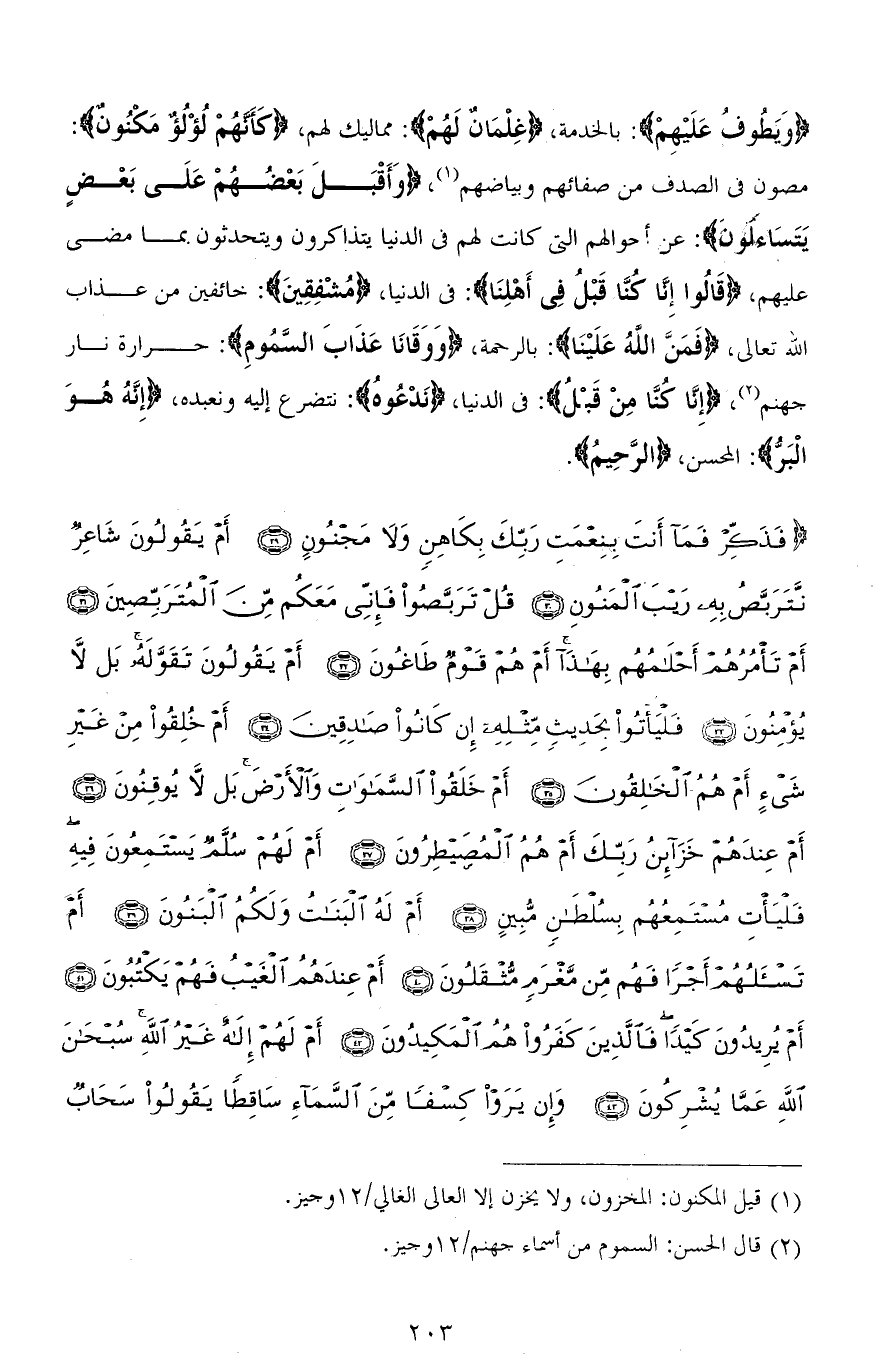(وَيَطُوفُ عَلَيْهِمْ): بالخدمة، (غِلْمَانٌ لَهُمْ): مماليك لهم، (كَأَنَّهُمْ لُؤْلُؤٌ مَكْنُونٌ): مصون في الصدف من صفائهم وبياضهم، (وَأَقْبَلَ بَعْضُهُمْ عَلَى بَعْضٍ يَتَسَاءَلُونَ): عن أحوالهم التي كانت لهم في الدنيا يتذاكرون ويتحدثون بما مضى عليهم، (قَالُوا إِنَّا كُنَّا قَبْلُ فِي أَهْلِنَا): في الدنيا، (مُشْفِقِينَ): خائفين من عذاب الله تعالى، (فَمَنَّ اللهُ عَلَيْنَا): بالرحمة، (وَوَقَانَا عَذَابَ السَّمُومِ): حرارة نار جهنم، (إِنَّا كُنَّا مِنْ قَبْلُ): في الدنيا، (نَدْعُوهُ): نتضرع إليه ونعبده، (إِنَّهُ هُوَ الْبَرُّ): المحسن، (الرَّحِيمُ).