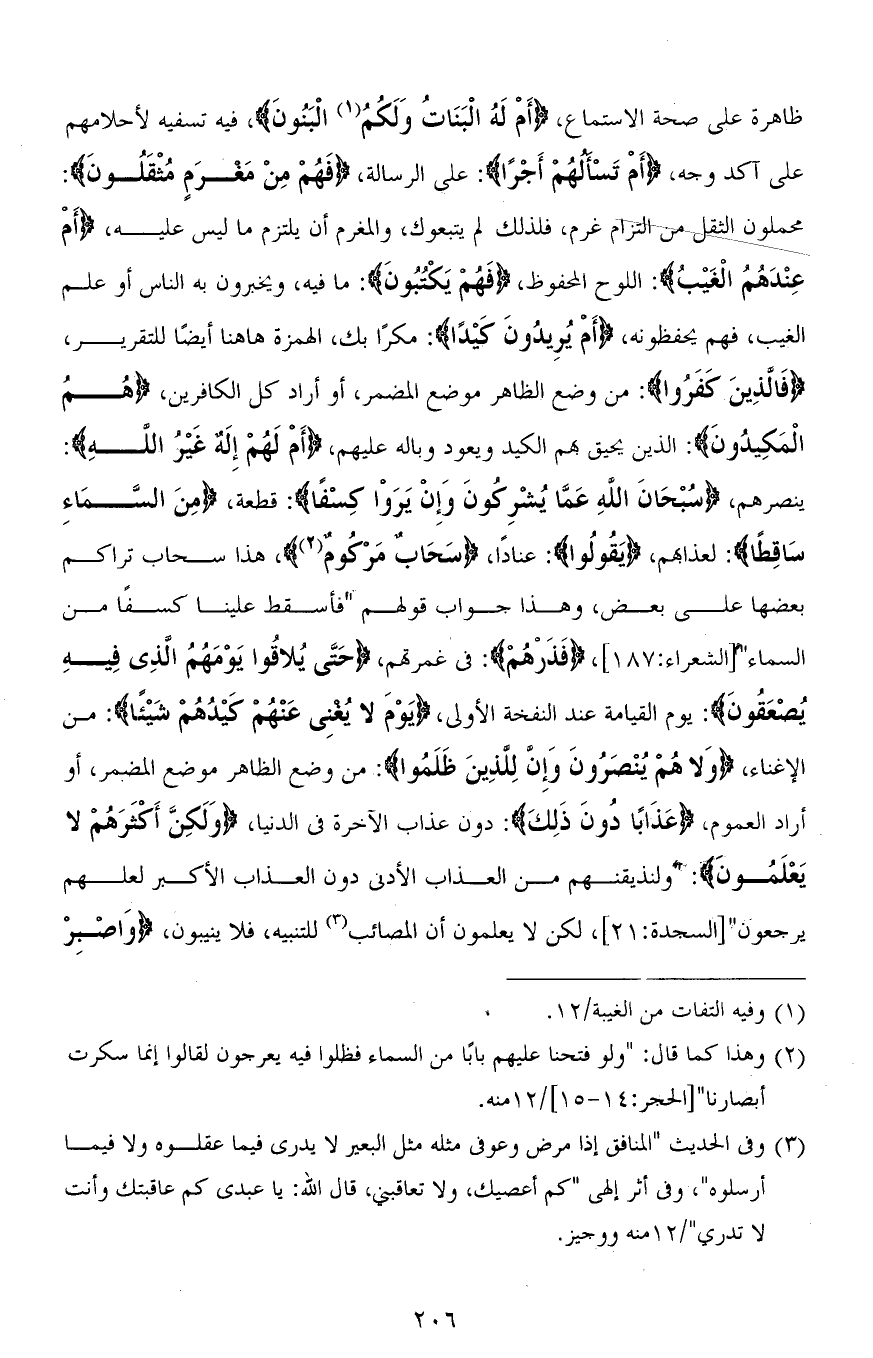 ظاهرة على صحة الاستماع، (أَمْ لَهُ الْبَنَاتُ وَلَكُمُ الْبَنُونَ)، فيه تسفيه لأحلامهم على آكد وجه، (أَمْ تَسْأَلُهُمْ أَجْرًا): على الرسالة، (فَهُمْ مِنْ مَغْرَمٍ مُثْقَلُونَ): محملون الثقل من التزام غرم، فلذلك لم يتبعوك، والمغرم أن يلتزم ما ليس عليه، (أَمْ عِنْدَهُمُ الْغَيْبُ): اللوح المحفوظ، (فَهُمْ يَكْتُبُونَ): ما فيه، ويخبرون به الناس أو علم الغيب، فهم يحفظونه، (أَمْ يُرِيدُونَ كَيْدًا): مكرًا بك، الهمزة هاهنا أيضًا للتقرير، (فَالَّذِينَ كَفَرُوا): من وضع الظاهر موضع المضمر، أو أراد كل الكافرين، (هُمُ الْمَكِيدُونَ): الذين يحيق بهم الكيد ويعود وباله عليهم، (أَمْ لَهُمْ إِلَهٌ غَيْرُ اللهِ): ينصرهم، (سُبْحَانَ اللهِ عَمَّا يُشْرِكونَ وَإِنْ يَرَوْا كِسْفًا): قطعة، (مِنَ السَّمَاءِ سَاقِطًا): لعذابهم، (يَقُولُوا): عنادًا، (سَحَابٌ مَرْكُومٌ)، هذا سحاب تراكم بعضها على بعض، وهذا جواب قولهم (فأسقط علينا كسفًا من السماء) [الشعراء: 187]، (فَذَرْهُمْ): في غمرتهم، (حَتَّى يُلاقُوا يَوْمَهُمُ الَّذِي فِيه يُصْعَقُونَ): يوم القيامة عند النفخة الأولى، (يَوْمَ لَا يُغْنِي عَنْهُمْ كَيْدُهُمْ شَيْئًا): من الإغناء، (وَلَا هُمْ يُنْصَرُونَ وَإِنَّ لِلَّذِينَ ظَلَمُوا): من وضع الظاهر موضع المضمر، أو أراد العموم، (عَذَابًا دُونَ ذَلِكَ): دون عذاب الآخرة في الدنيا، (وَلَكِنَّ أَكْثَرَهُمْ لا يَعْلَمُون): (وَلَنُذِيقَنَّهُمْ مِنَ الْعَذَابِ الْأَدْنَى دُونَ الْعَذَابِ الْأَكْبَرِ لَعَلَّهُمْ يَرْجِعُونَ) [السجدة: 21]، لكن لا يعلمون أن المصائب للتنبيه، فلا ينيبون، (وَاصْبِرْ