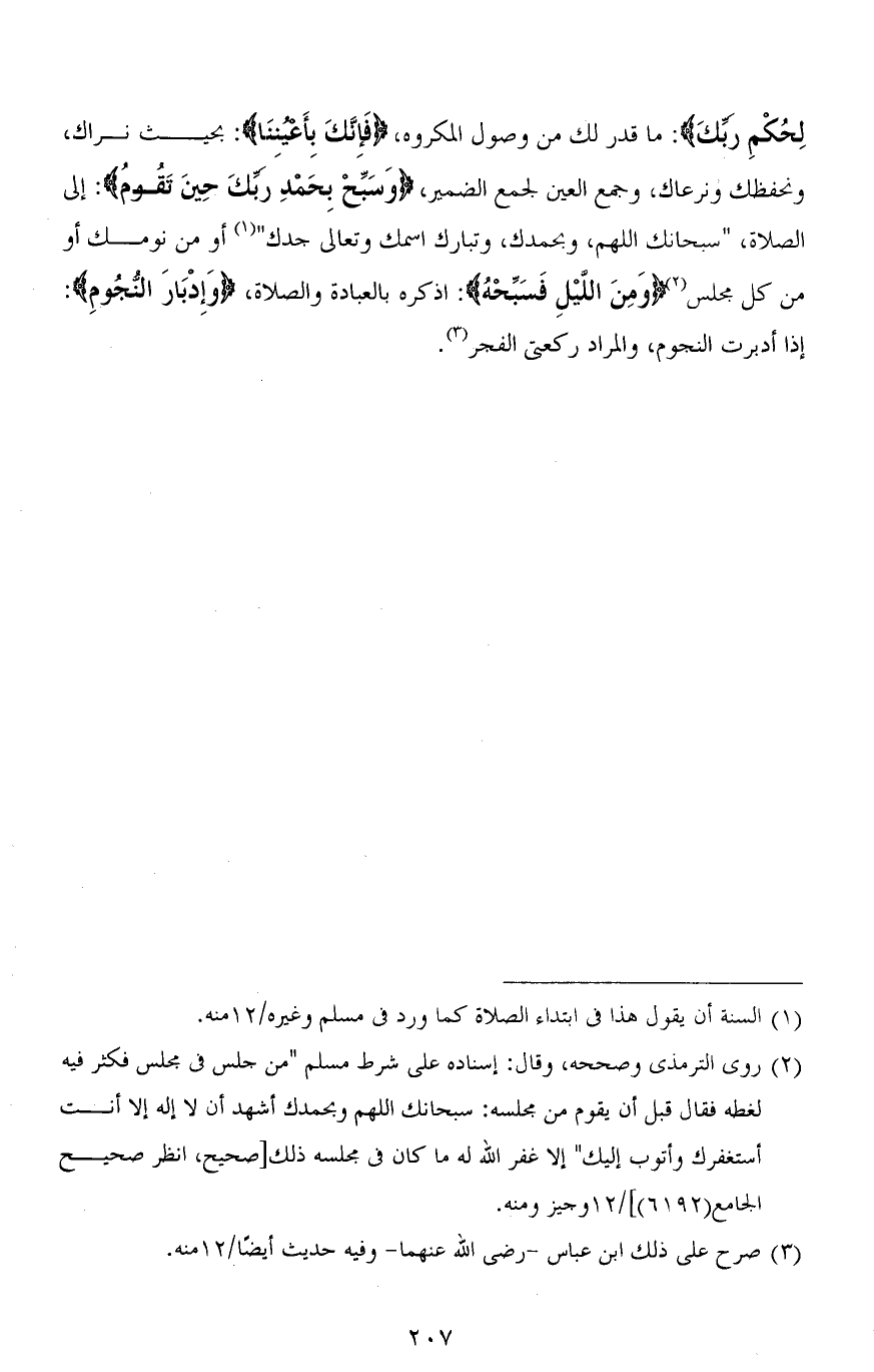 لِحُكْمِ رَبِّكَ): ما قدر لك من وصول المكروه، (فَإِنَّكَ بِأَعْيُنِنَا): بحيث نراك، ونحفظك ونرعاك، وجمع العين لجمع الضمير، (وَسَبِّحْ بِحَمْدِ رَبِّكَ حِينَ تَقُومُ): إلى الصلاة، " سبحانك اللهم، وبحمدك، وتبارك اسمك وتعالى جدك " أو من نومك أو من كل مجلس (وَمِنَ اللَّيْلِ فَسَبِّحْهُ): اذكره بالعبادة والصلاة، (وَإِدْبَارَ النُّجُومِ): إذا أدبرت النجوم، والمراد ركعتي الفجر.