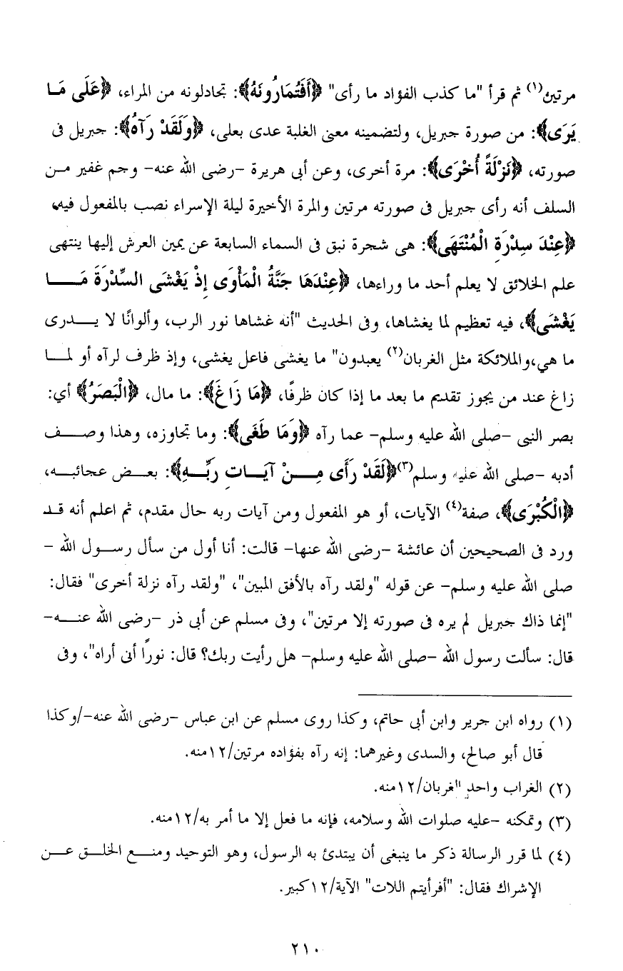 مرتين ثم قرأ (مَا كَذَبَ الْفُؤَادُ مَا رَأَى) (أَفَتُمَارُونَهُ): تجادلونه من المراء، (عَلَى مَا يَرَى): من صورة جبريل، ولتضمينه معنى الغلبة عدى بعلى، (وَلَقَدْ رَآهُ): جبريل في صورته، (نَزْلَةً أُخْرَى): مرة أخرى، وعن أبي هريرة - رضي الله عنه - وجم غفير من السلف أنه رأى جبريل في صورته مرتين والمرة الأخيرة ليلة الإسراء نصب بالمفعول فيه، (عِندَ سِدْرَةِ الْمُنْتَهَى): هي شجرة نبق في السماء السابعة عن يمين العرش إليها ينتهي علم الخلائق لا يعلم أحد ما وراءها، (عِنْدَهَا جَنَّةُ الْمَأْوَى إِذْ يَغْشَى السِّدْرَةَ مَا يَغْشَى)، فيه تعظيم لما يغشاها، وفي الحديث " أنه غشاها نور الربِّ، وألوانًا لا يدري ما هي، والملائكة مثل الغربان يعبدون " ما يغشى فاعل يغشى، وإذ ظرف لـ رآه أو لما زاغ عند من يجوز تقديم ما بعد ما إذا كان ظرفًا، (مَا زَاغَ): ما مال، (الْبَصَرُ) أي: بصر النبي - صلى الله عليه وسلم - عما رآه (وَمَا طَغَى): ما تجاوزه، وهذا وصف أدبه - صلى الله عليه وسلم - (لَقَدْ رَأَى مِنْ آيَاتِ ربِّهِ): بعض عجائبه، (الْكُبْرَى)، صفة الآيات، أو هو المفعول ومن آيات ربه حال مقدم، ثم اعلم أنه قد ورد في الصحيحين أن عائشة - رضي الله عنها - قالت: أنا أول من سأل رسول الله - صلى الله عليه وسلم - عن قوله " ولقد رآه بالأفق المبين "، " ولقد رآه نزلة أخرى " فقال: " إنما ذاك جبريل لم يره في صورته إلا مرتين "، وفي مسلم عن أبي ذر - رضي الله عنه - قال: سألت رسول الله - صلى الله عليه وسلم - هل رأيت ربَّك؟ قال: [نُورٌ] أَنَّى أَرَاهُ "، وفي