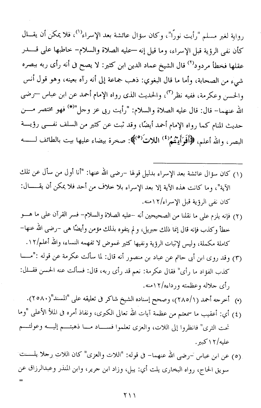 رواية لغير مسلم " رأيت نورًا "، وكان سؤال عائشة بعد الإسراء، فلا يمكن أن يقال كأن نفي الرؤية قبل الإسراء، وما قيل إنه - عليه الصلاة والسلام - خاطبها على قدر عقلها فخطأ مردود قال الشيخ عماد الدين ابن كثير: لا يصح في أنه رأى ربه ببصره شيء عن الصحابة، وأما ما قال البغوي: ذهب جماعة إلى أنه رآه بعينه، وهو قول أنس والحسن وعكرمة، ففيه نظر، والحديث الذي رواه الإمام أحمد عن ابن عباس - رضي الله عنهما - قال: قال عليه الصلاة والسلام: " رأيت ربي عز وجل " فهو مختصر من حديث المنام كما رواه الإمام أحمد أيضًا، وقد ثبت عن كثير من السلف نفي رؤية البصر، والله أعلم، (أَفَرَأَيْتُمُ اللَّاتَ): صخرة بيضاء عليها بيت بالطائف له