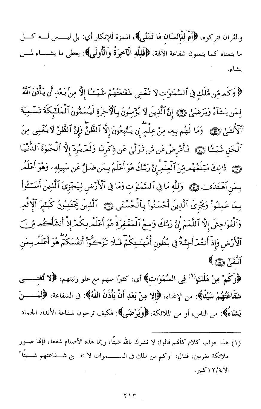(وَكَمْ مِنْ مَلَكٍ فِي السَّمَاوَاتِ لَا تُغْنِي شَفَاعَتُهُمْ شَيْئًا إِلَّا مِنْ بَعْدِ أَنْ يَأْذَنَ اللهُ لِمَنْ يَشَاءُ وَيَرْضَى (26) إِنَّ الَّذِينَ لَا يُؤْمِنُونَ بِالْآخِرَةِ لَيُسَمُّونَ الْمَلَائِكَةَ تَسْمِيَةَ الْأُنْثَى (27) وَمَا لَهُمْ بِهِ مِنْ عِلْمٍ إِنْ يَتَّبِعُونَ إِلَّا الظَّنَّ وَإِنَّ الظَّنَّ لَا يُغْنِي مِنَ الْحَقِّ شَيْئًا (28) فَأَعْرِضْ عَنْ مَنْ تَوَلَّى عَنْ ذِكْرِنَا وَلَمْ يُرِدْ إِلَّا الْحَيَاةَ الدُّنْيَا (29) ذَلِكَ مَبْلَغُهُمْ مِنَ الْعِلْمِ إِنَّ رَبَّكَ هُوَ أَعْلَمُ بِمَنْ ضَلَّ عَنْ سَبِيلِهِ وَهُوَ أَعْلَمُ بِمَنِ اهْتَدَى (30) وَلله مَا فِي السَّمَاوَاتِ وَمَا فِي الْأَرْضِ لِيَجْزِيَ الَّذِينَ أَسَاءُوا بِمَا عَمِلُوا وَيَجْزِيَ الَّذِينَ أَحْسَنُوا بِالْحُسْنَى (31) الَّذِينَ يَجْتَنِبُونَ كَبَائِرَ الْإِثْمِ وَالْفَوَاحِشَ إِلَّا اللَّمَمَ إِنَّ رَبَّكَ وَاسِعُ الْمَغْفِرَةِ هُوَ أَعْلَمُ بِكُمْ إِذْ أَنْشَأَكُمْ مِنَ الْأَرْضِ وَإِذْ أَنْتُمْ أَجِنَّةٌ فِي بُطُونِ أُمَّهَاتِكُمْ فَلَا تُزَكُّوا أَنْفُسَكُمْ هُوَ أَعْلَمُ بِمَنِ اتَّقَى (32)
