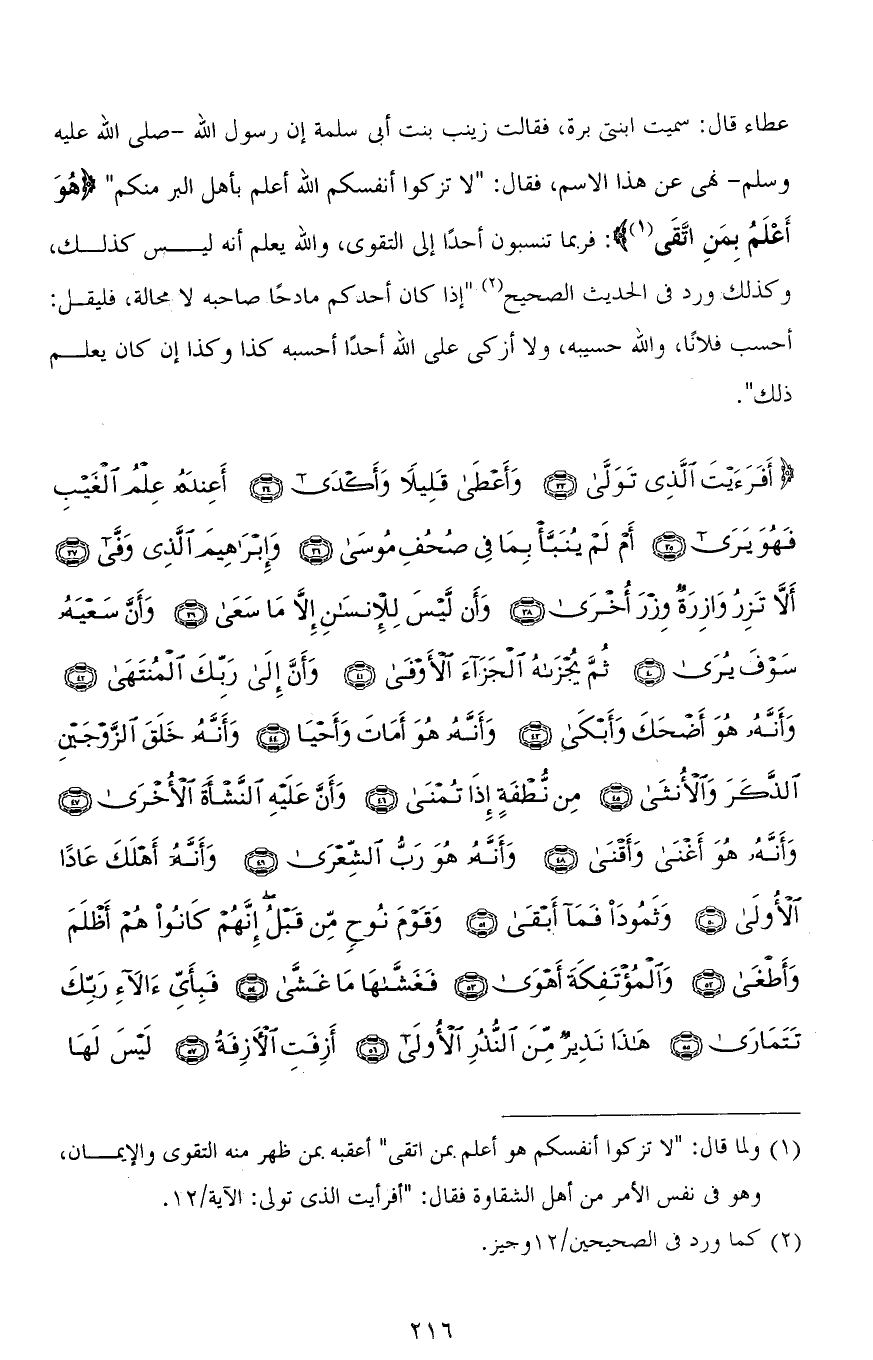عطاء قال: سميت ابنتي برة، فقالت زينب بنت أبى سلمة إن رسول الله - صلى الله عليه وسلم - نهى عن هذا الاسم، فقال: " لا تزكوا أنفسكم الله أعلم بأهل البر منكم " (هُوَ أَعْلَمُ بِمَنِ اتَّقَى): فربما تنسبون أحدًا إلى التقوى، والله يعلم أنه ليس كذلك، وكذلك ورد في الحديث الصحيح " إذا كان أحدكم مادحًا صاحبه لا محالة، فليقل: أحسب فلانًا، والله حسيبه، ولا أزكي على الله أحدًا أحسبه كذا وكذا إن كان يعلم ذلك ".