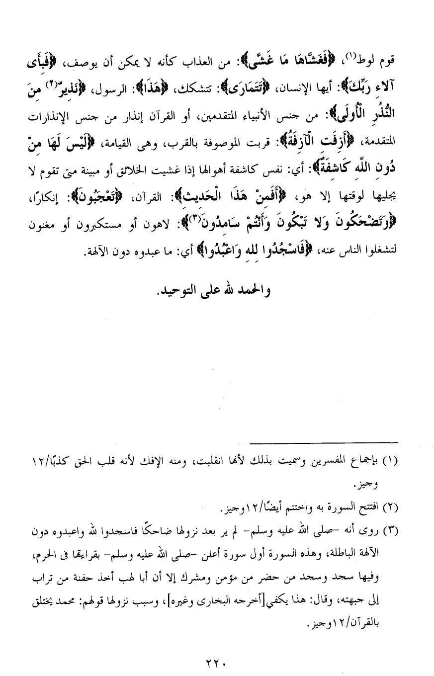 قوم لوط، (فَغَشَّاهَا مَا غَشَّى): من العذاب كأنه لا يمكن أن يوصف، (فَبِأَى آلاءِ رَبِّكَ): أيها الإنسان، (تَتَمَارَى): تتشكك، (هذَا): الرسول، (نَذِيرٌ مِنَ النُّذُرِ الْأُولَى): من جنس الأنبياء المتقدمين، أو القرآن إنذار من جنس الإنذارات المتقدمة، (أَزِفَتِ الْآزِفَةُ): قربت الموصوفة بالقرب، وهي القيامة، (لَيْسَ لَهَا مِنْ دُونِ اللهِ كَاشِفَةٌ): أي: نفس كاشفة أهوالها إذا غشيت الخلائق أو مبينة متى تقوم لا يجليها لوقتها إلا هو، (أَفَمِنْ هَذَا الْحَديث): القرآن، (تَعْجَبُونَ): إنكارًا، (وَتَضْحَكُونَ وَلَا تَبْكُونَ وَأَنْتُمْ سَامِدُونَ): لاهون أو مستكبرون أو مغنون لتشغلوا الناس) عنه، (فَاسْجُدُوا لله وَاعْبُدُوا) أي: ما عبدوه دون الآلهة.