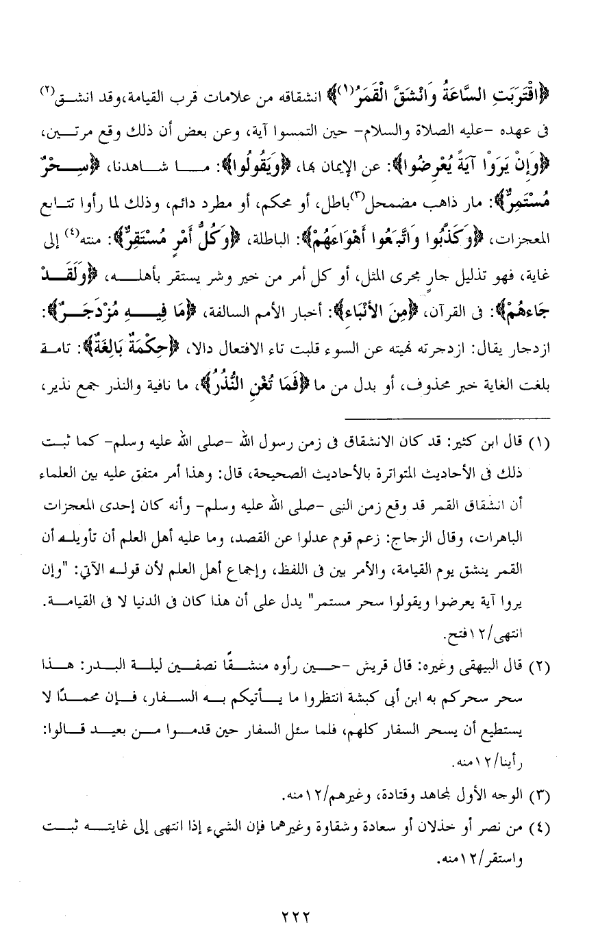 (اقْتَرَبَتِ السَّاعَةُ وَانْشَقَّ الْقَمَرُ) انشقاقه من علامات قرب القيامة، وقد انشق فى عهده - عليه الصلاة والسلام - حين التمسوا آية، وعن بعض أن ذلك وقع مرتين، (وَإِنْ يَرَوْا آيَةً يُعْرِضُوا): عن الإيمان بما، (وَيَقُولُوا): ما شاهدنا، (سِحْرٌ مُسْتَمِرٌّ): مار ذاهب مضمحل باطل، أو محكم، أو مطرد دائم، وذلك لما رأوا تتابع المعجزات، (وَكَذَّبُوا وَاتَّبَعُوا أَهْوَاءَهُمْ)؛ الباطلة، (وَكُلُّ أَمْرٍ مُسْتَقِرٌّ): منتهٍ إلى غاية، فهو [تدليل] جارٍ مجرى المثل، أو كل أمر من خير وشر يستقر بأهله، (وَلَقَدْ جَاءهُمْ): في القرآن، (مِنَ الأنْبَاءِ): أخبار الأمم السالفة، (مَا فِيهِ مُزْدَجَرٌ): ازدجار يقال: ازدجرته نهيته عن السوء قلبت تاء الافتعال دالاً، (حِكْمَةٌ بَالِغَةٌ): تامة بلغت الغاية خبر محذوف، أو بدل من ما (فَمَا تُغْنِ النُّذُرُ)، ما نافية والنذر جمع نذير،