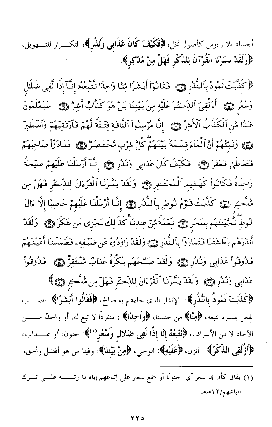(كَذَّبَتْ ثَمُودُ بِالنُّذُرِ (23) فَقَالُوا أَبَشَرًا مِنَّا وَاحِدًا نَتَّبِعُهُ إِنَّا إِذًا لَفِي ضَلَالٍ وَسُعُرٍ (24) أَأُلْقِيَ الذِّكْرُ عَلَيْهِ مِنْ بَيْنِنَا بَلْ هُوَ كَذَّابٌ أَشِرٌ (25) سَيَعْلَمُونَ غَدًا مَنِ الْكَذَّابُ الْأَشِرُ (26) إِنَّا مُرْسِلُو النَّاقَةِ فِتْنَةً لَهُمْ فَارْتَقِبْهُمْ وَاصْطَبِرْ (27) وَنَبِّئْهُمْ أَنَّ الْمَاءَ قِسْمَةٌ بَيْنَهُمْ كُلُّ شِرْبٍ مُحْتَضَرٌ (28) فَنَادَوْا صَاحِبَهُمْ فَتَعَاطَى فَعَقَرَ (29) فَكَيْفَ كَانَ عَذَابِي وَنُذُرِ (30) إِنَّا أَرْسَلْنَا عَلَيْهِمْ صَيْحَةً وَاحِدَةً فَكَانُوا كَهَشِيمِ الْمُحْتَظِرِ (31) وَلَقَدْ يَسَّرْنَا الْقُرْآنَ لِلذِّكْرِ فَهَلْ مِنْ مُدَّكِرٍ (32) كَذَّبَتْ قَوْمُ لُوطٍ بِالنُّذُرِ (33) إِنَّا أَرْسَلْنَا عَلَيْهِمْ حَاصِبًا إِلَّا آلَ لُوطٍ نَجَّيْنَاهُمْ بِسَحَرٍ (34) نِعْمَةً مِنْ عِنْدِنَا كَذَلِكَ نَجْزِي مَنْ شَكَرَ (35) وَلَقَدْ أَنْذَرَهُمْ بَطْشَتَنَا فَتَمَارَوْا بِالنُّذُرِ (36) وَلَقَدْ رَاوَدُوهُ عَنْ ضَيْفِهِ فَطَمَسْنَا أَعْيُنَهُمْ فَذُوقُوا عَذَابِي وَنُذُرِ (37) وَلَقَدْ صَبَّحَهُمْ بُكْرَةً عَذَابٌ مُسْتَقِرٌّ (38) فَذُوقُوا عَذَابِي وَنُذُرِ (39) وَلَقَدْ يَسَّرْنَا الْقُرْآنَ لِلذِّكْرِ فَهَلْ مِنْ مُدَّكِرٍ (40)