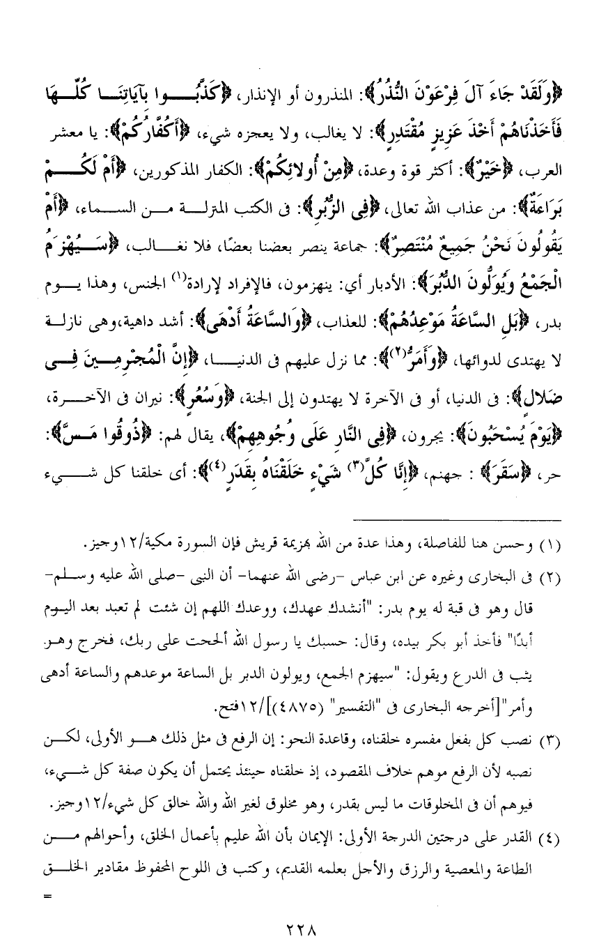 (وَلَقَدْ جَاءَ آلَ فِرْعَوْنَ النُّذُرُ): المنذرون أو الإنذار، (كَذبُوا بِآيَاتِنَا كلِّهَا فَأَخَذْنَاهُمْ أَخْذَ عَزِيزٍ مُقْتَدِرٍ): لا يغالب، ولا يعجزه شيء، (أَكُفارَكُمْ): يا معشر العرب، (خَيْرٌ): أكثر قوة وعدة، (مِنْ أُولَئِكُمْ): الكفار المذكورين، (أَمْ لَكُمْ بَرَاءَةٌ): من عذاب الله تعالى، (فِي الزُّبُرِ): في الكتب المنزلة من السماء، (أَمْ يَقُولُونَ نَحْنُ جَمِيعٌ مُنْتَصِرٌ): جماعة ينصر بعضنا بعضًا، فلا نغالب، (سَيُهْزَمُ الْجَمْعُ وَيُوَلُّونَ الدُّبُرَ): الأدبار أي: ينهزمون، فالإفراد لإرادة الجنس، وهذا يوم بدر، (بَلِ السَّاعَةُ مَوْعِدُهُمْ): للعذاب، (وَالسَّاعَةُ أَدْهَى): أشد داهية، وهي نازلة لا يهتدى لدوائها، (وَأَمَرُّ): مما نزل عليهم في الدنيا، (إِنَّ الْمُجْرِمِينَ فِي ضَلَالٍ): في الدنيا، أو في الآخرة لا يهتدون إلى الجنة، (وَسُعُرٍ): نيران في الآخرة، (يَوْمَ يُسْحَبُونَ): يجرون، (فِى النَّارِ عَلَى وُجوهِهِمْ)، يقال لهم: (ذُوقُوا مَسَّ): حر، (سَقَرَ): جهنم، (إِنَّا كُلَّ شَيْءٍ خَلَقْنَاهُ بِقَدَرٍرٍ): أي خلقنا كل شيء