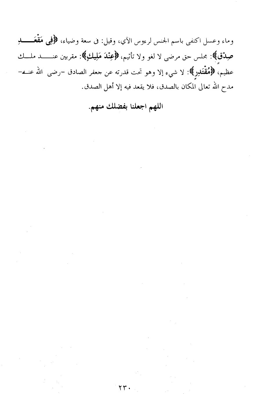 وماء وعسل اكتفى باسم الجنس لرءوس الآي، وقيل: في سعة وضياء، (فِي مَقْعَدِ صِدْقٍ): مجلس حق مرضي لا لغو ولا تأتيم، (عِنْدَ مَلِيكٍ): مقربين عند ملك عظيم، (مُقْتَدِرٍ): لا شيء إلا وهو تحت قدرته عن جعفر الصادق - رضي الله عنه - مدح الله تعالى المكان بالصدق، فلا يقعد فيه إلا أهل الصدق.