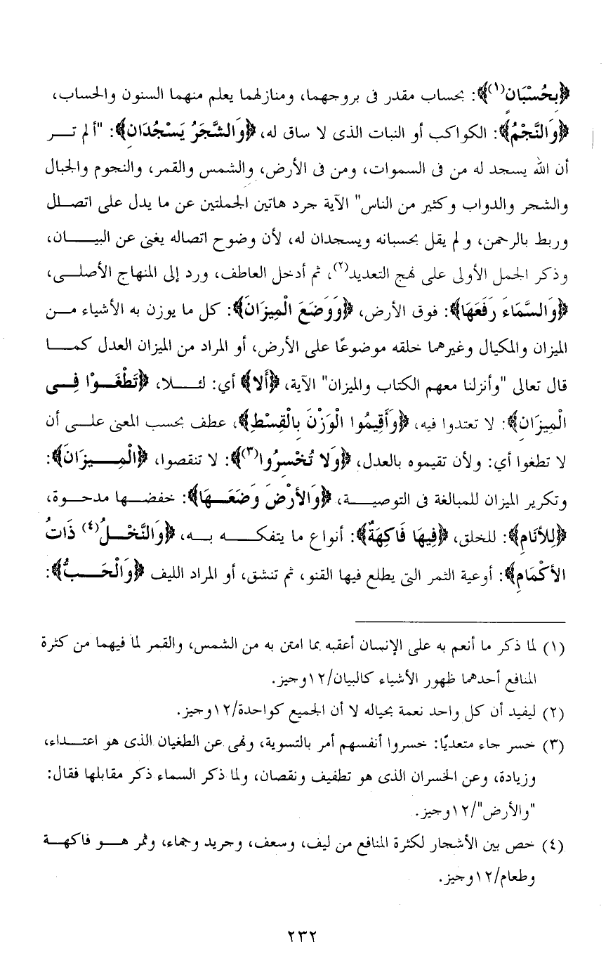 (بِحُسْبانٍ): بحساب مقدر في بروجهما، ومنازلهما يعلم منهما السنون والحساب، (وَالنَّجْمُ): الكواكب أو النبات الذي لا ساق له، (وَالشَّجَرُ يَسْجُدَان): (أَلَمْ تَرَ أَنَّ اللهَ يَسْجُدُ لَهُ مَنْ فِي السَّمَاوَاتِ وَمَنْ فِي الْأَرْضِ وَالشَّمْسُ وَالْقَمَرُ وَالنُّجُومُ وَالْجِبَالُ وَالشَّجَرُ وَالدَّوَابُّ وَكَثِيرٌ مِنَ النَّاسِ) الآية جرد هاتين الجملتين عن ما يدل على اتصال وربط بالرحمن، ولم يقل بحسبانه ويسجدان له، لأن وضوح اتصاله يغني عن البيان، وذكر الجمل الأولى على نهج التعديد، ثم أدخل العاطف، ورد إلى المنهاج الأصلي، (وَالسَّماءَ رَفَعَهَا): فوق الأرض، (وَوَضَعَ الْمِيزَانَ): كل ما يوزن به الأشياء من الميزان والمكيال وغيرهما خلقه موضوعًا على الأرض، أو المراد من الميزان العدل كما قال تعالى (وأنزلنا معهم الكتاب والميزان) الآية، (أَلَّا) أي: لئلا، (تَطْغَوْا فِي الْمِيزَانِ): لا تعتدوا فيه، (وَأَقِيمُوا الْوَزنَ بِالْقِسْطِ)، عطف بحسب المعنى على أَلَّا تَطْغَوْا أي: ولأن تقيموه بالعدل، (وَلا تخْسِرُوا): لا تنقصوا، (الْمِيزَانَ): وتكرير الميزان للمبالغة في التوصية، (وَالأرْضَ وَضَعَهَا): خفضها مدحوة، (لِلأنَامِ): للخلق، (فيهَا فَاكِهَةٌ): أنواع ما يتفكه به، (وَالنَّخْلُ ذَاتُ الْأَكْمَامِ): أوعية الثمر التي يطلع فيها القنو، ثم تنشق، أو المراد الليف (وَالْحَبُّ):
