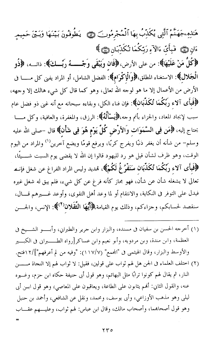 (كُلُّ مَنْ عَلَيْهَا): من على الأرض، (فَانٍ وَيَبْقَى وَجْهُ ربِّكَ): ذاته، (ذُو الْجَلالِ): الاستغناء المطلق، (وَالإكْرَامِ). الفضل الشامل، أو المراد يفنى كل ما في الأرض من الأعمال إلا ما هو لوجه الله تعالى، وهو كما قال (كُلُّ شَيْءٍ هَالِكٌ إِلَّا وَجْهَهُ)، (فَبِأَيِّ آلَاءِ رَبِّكُمَا تُكَذِّبَانِ): فإن فناء الكل، وبقاءه سبحانه مع أنه غني ذو فضل عام سبب لإيجاد المعاد، والجزاء بأتم وجه، (يَسْأَلُهُ): الرزق، والمغفرة، والعافية، وكل ما يحتاج إليه، (مَنْ فِي السَّمَاوَاتِ وَالْأَرْضِ كُلَّ يَوْمٍ هُوَ فِي شَأْنٍ) قال - صلى الله عليه وسلم - من شأنه أن يغفر ذنبًا ويفرج كربًا، ويرفع قومًا ويضع آخرين والمراد من اليوم الوقت، وهو ظرف لشأن قيل هو رد لليهود قالوا إن الله لا يقضي يوم السبت شيئًا، (فَبِأَيِّ آلَاءِ رَبِّكُمَا تُكَذِّبَانِ سَنَفْرُغُ لَكُمْ)، تهديد وليس المراد الفراغ عن شغل فإنه تعالى لا يشغله شأن عن شأن، فهو مجاز كأنه فرغ عن كل شيء، فلم يبق له شغل غيره فيدل على التوفر في النكاية، والانتقام أو لما وعد أهل التقوى، وأوعد غيرهم قال، سنقصد لحسابكم، وجزاءكم، وذلك يوم القيامة (أَيُّهَ الثَّقَلَانِ): الإنس، والجن