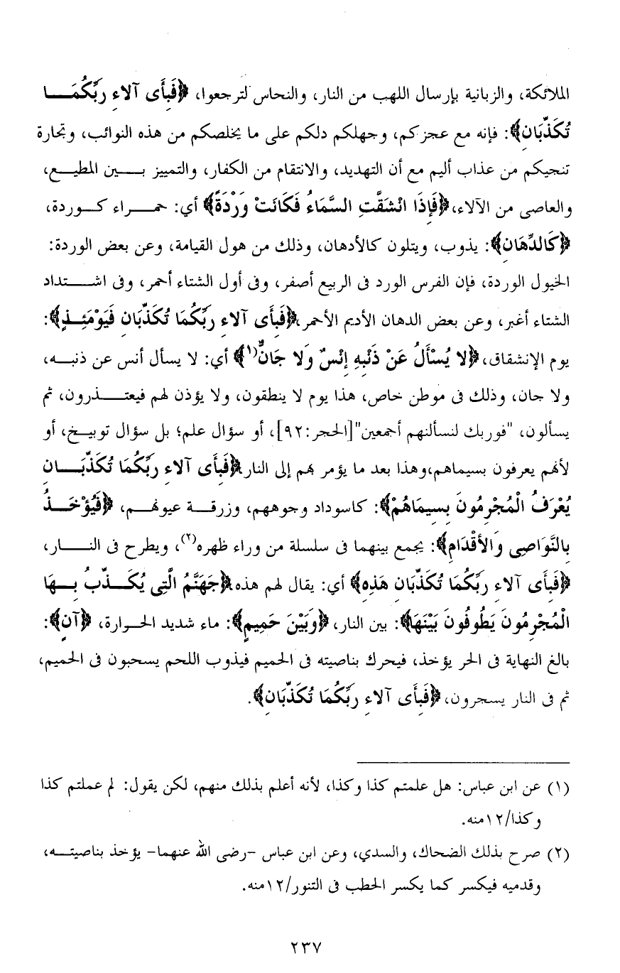 الملائكة، والزبانية بإرسال اللهب من النار، والنحاس لترجعوا، (فَبِأَيِّ آلَاءِ رَبِّكُمَا تُكَذِّبَانِ): فإنه مع عجزكم، وجهلكم دلكم على ما يخلصكم من هذه النوائب، وتجارة تنجيكم من عذاب أليم مع أن التهديد، والانتقام من الكفار، والتمييز بين المطيع، والعاصي من الآلاء، (فَإِذَا انْشَقَّتِ السَّمَاءُ فَكَانَتْ وَرْدَةً) أي: حمراء كوردة، (كَالدِّهَانِ): يذوب، ويتلون كالأدهان، وذلك من هول القيامة، وعن بعض الوردة: الخيول الوردة، فإن الفرس الورد في الربيع أصفر، وفي أول الشتاء أحمر، وفي اشتداد الشتاء أغبر، وعن بعض الدهان الأديم الأحمر، (فَبِأَيِّ آلَاءِ رَبِّكُمَا تُكَذِّبَانِ فَيَوْمَئِذٍ): يوم الإنشقاق، (لَا يُسْأَلُ عَنْ ذَنْبِهِ إِنْسٌ وَلَا جَانٌّ) أي: لا يسأل إنسٌ عن ذنبه، ولا جانٌّ، وذلك في موطن خاص، هذا يوم لا ينطقون، ولا يؤذن لهم فيعتذرون، ثم يسألون، " فوربك لنسألنهم أجمعين " [الحجر: 92]، أو سؤال علم؛ بل سؤال توبيخ، أو لأنَّهُم يعرفون بسيماهم، وهذا بعد ما يؤمر بهم إلى النار (فَبِأَيِّ آلَاءِ رَبِّكُمَا تُكَذِّبَانِ يُعْرَفُ الْمُجْرِمُونَ بسيمَاهُمْ): كاسوداد وجوههم، وزرقة عيونهم، (فَيُؤْخَذُ بِالنَّوَاصِي وَالْأَقْدَامِ) يجمع بينهما في سلسلة من وراء ظهره، ويطرح في النار، (فَبِأَيِّ آلَاءِ رَبِّكُمَا تُكَذِّبَانِ هَذِهِ) أي: يقال لهم هذه (جَهَنَّمُ الَّتِي يُكَذِّبُ بِهَا الْمُجْرِمُونَ يَطُوفُونَ بَيْنَهَا). بين النار، (وَبَيْنَ حَمِيمٍ): ماء شديد الحرارة، (آنٍ): بالغ النهاية في الحر يؤخذ، فيحرك بناصيته في الحميم فيذوب اللحم يسحبون في الحميم، ثم في النار يسجرون، (فَبِأَيِّ آلَاءِ رَبِّكُمَا تُكَذِّبَانِ).