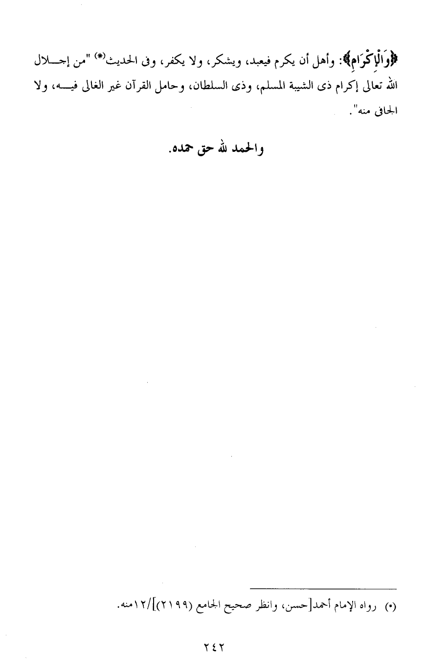 (وَالْإِكْرَامِ): وأهل أن يكرم فيعبد، ويشكر، ولا يكفر، وفي الحديث " من إجلال الله تعالى إكرام ذي الشيبة المسلم، وذي السلطان، وحامل القرآن غير الغالي فيه، ولا الجافي منه " (1).