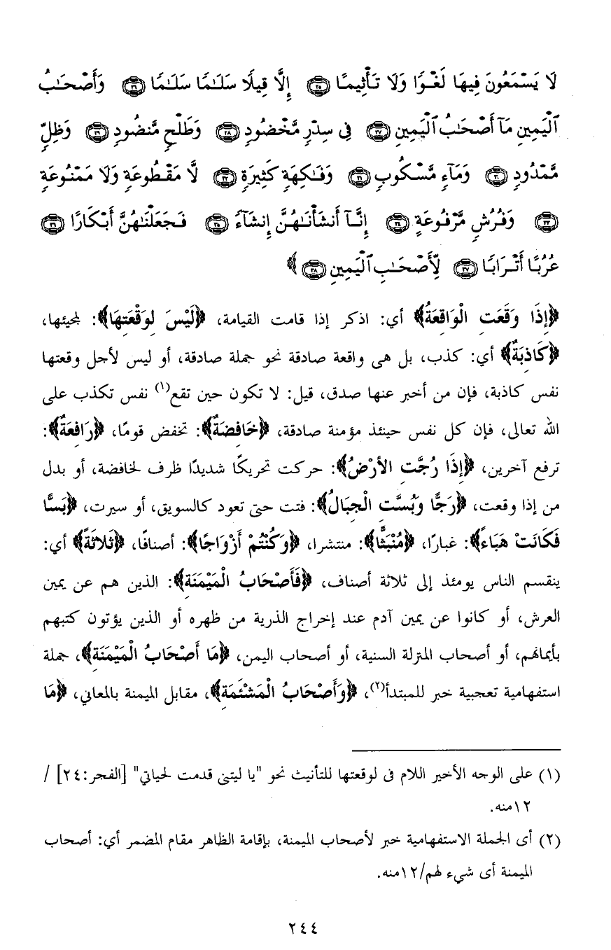(إِذَا وَقَعَتِ الْوَاقِعَةُ) أي: اذكر إذا قامت القيامة، (لَيْسَ لِوَقْعَتِهَا): لمجيئها، (كَاذِبَةٌ) أي: كذب، بل هي واقعة صادقة نحو جملة صادقة، أو ليس لأجل وقعتها نفس كاذبة، فإن من أخبر عنها صدق، قيل: لا تكون حين تقع نفس تكذب على الله تعالى، فإن كل نفس حينئذ مؤمنة صادقة، (خَافِضَةٌ): تخفض قومًا، (رَافِعَةٌ): ترفع آخرين، (إِذَا رُجَّتِ الْأَرْضُ): حركت تحريكًا شديدًا ظرف لخافضة، أو بدل من إذا وقعت، (رَجًّا وَبُسَّتِ الْجِبَالُ): فتت حتى تعود كالسويق، أو سيرت، (بَسًّا فَكَانَتْ هَبَاءً): غبارًا، (مُنْبَثًّا): منتشرًا، (وَكُنتمْ أَزْوَاجًا): أصنافًا، (ثَلَاثةً) أي: ينقسم الناس يومئذ إلى ثلاثة أصناف، (فَأَصْحَابُ الْمَيْمَنَةِ): الذين هم عن يمين العرش، أو كانوا عن يمين آدم عند إخراج الذرية من ظهره أو الذين يؤتون كتبهم بأيمانهم، أو أصحاب المنزلة السنية، أو أصحاب اليُمن، (مَا أَصْحَابُ الْمَيْمَنَةِ)، جملة استفهامية تعجبية خبر للمبتدأ، (وَأَصْحَابُ الْمَشْأَمَةِ)، مقابل الميمنة بالمعاني، (مَا