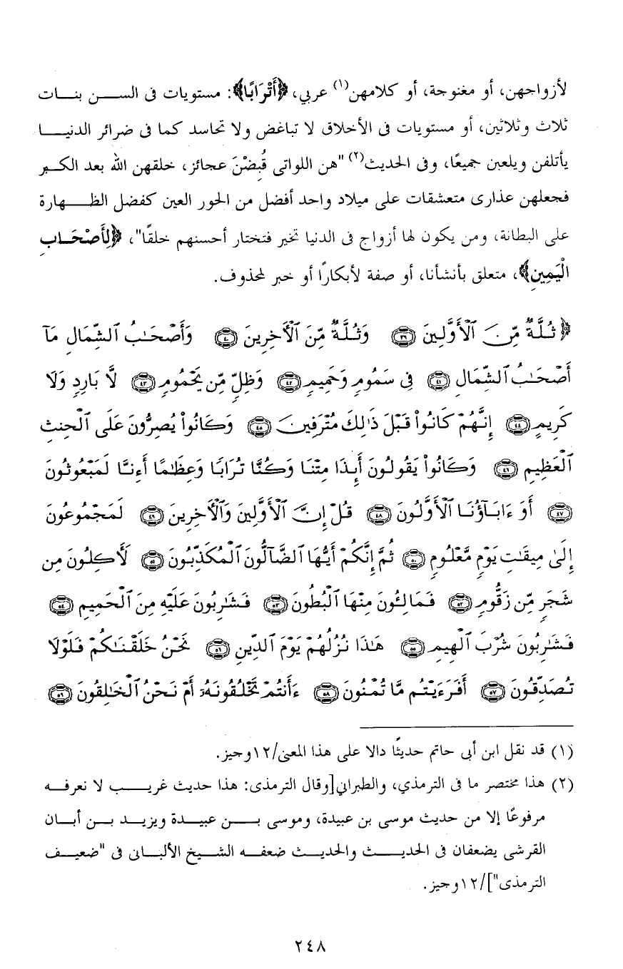 (ثُلَّةٌ مِنَ الْأَوَّلِينَ (39) وَثُلَّةٌ مِنَ الْآخِرِينَ (40) وَأَصْحَابُ الشِّمَالِ مَا أَصْحَابُ الشِّمَالِ (41) فِي سَمُومٍ وَحَمِيمٍ (42) وَظِلٍّ مِنْ يَحْمُومٍ (43) لَا بَارِدٍ وَلَا كَرِيمٍ (44) إِنَّهُمْ كَانُوا قَبْلَ ذَلِكَ مُتْرَفِينَ (45) وَكَانُوا يُصِرُّونَ عَلَى الْحِنْثِ الْعَظِيمِ (46) وَكَانُوا يَقُولُونَ أَئِذَا مِتْنَا وَكُنَّا تُرَابًا وَعِظَامًا أَإِنَّا لَمَبْعُوثُونَ (47) أَوَآبَاؤُنَا الْأَوَّلُونَ (48) قُلْ إِنَّ الْأَوَّلِينَ وَالْآخِرِينَ (49) لَمَجْمُوعُونَ إِلَى مِيقَاتِ يَوْمٍ مَعْلُومٍ (50) ثُمَّ إِنَّكُمْ أَيُّهَا الضَّالُّونَ الْمُكَذِّبُونَ (51) لَآكِلُونَ مِنْ شَجَرٍ مِنْ زَقُّومٍ (52) فَمَالِئُونَ مِنْهَا الْبُطُونَ (53) فَشَارِبُونَ عَلَيْهِ مِنَ الْحَمِيمِ (54) فَشَارِبُونَ شُرْبَ الْهِيمِ (55) هَذَا نُزُلُهُمْ يَوْمَ الدِّينِ (56) نَحْنُ خَلَقْنَاكُمْ فَلَوْلَا تُصَدِّقُونَ (57) أَفَرَأَيْتُمْ مَا تُمْنُونَ (58) أَأَنْتُمْ تَخْلُقُونَهُ أَمْ نَحْنُ الْخَالِقُونَ (59)