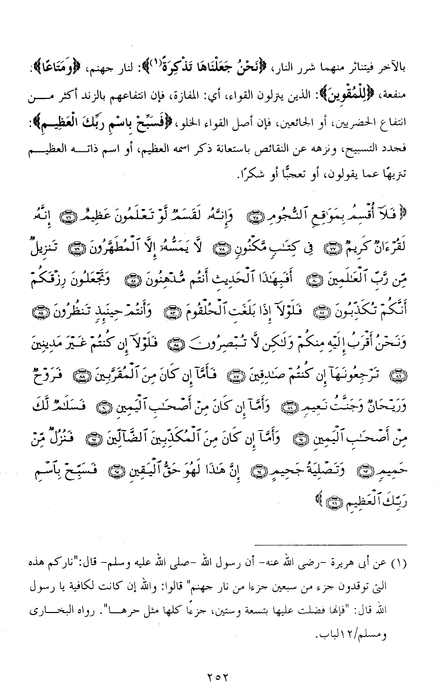(فَلَا أُقْسِمُ بِمَوَاقِعِ النُّجُومِ (75) وَإِنَّهُ لَقَسَمٌ لَوْ تَعْلَمُونَ عَظِيمٌ (76) إِنَّهُ لَقُرْآنٌ كَرِيمٌ (77) فِي كِتَابٍ مَكْنُونٍ (78) لَا يَمَسُّهُ إِلَّا الْمُطَهَّرُونَ (79) تَنْزِيلٌ مِنْ رَبِّ الْعَالَمِينَ (80) أَفَبِهَذَا الْحَدِيثِ أَنْتُمْ مُدْهِنُونَ (81) وَتَجْعَلُونَ رِزْقَكُمْ أَنَّكُمْ تُكَذِّبُونَ (82) فَلَوْلَا إِذَا بَلَغَتِ الْحُلْقُومَ (83) وَأَنْتُمْ حِينَئِذٍ تَنْظُرُونَ (84) وَنَحْنُ أَقْرَبُ إِلَيْهِ مِنْكُمْ وَلَكِنْ لَا تُبْصِرُونَ (85) فَلَوْلَا إِنْ كُنْتُمْ غَيْرَ مَدِينِينَ (86) تَرْجِعُونَهَا إِنْ كُنْتُمْ صَادِقِينَ (87) فَأَمَّا إِنْ كَانَ مِنَ الْمُقَرَّبِينَ (88) فَرَوْحٌ وَرَيْحَانٌ وَجَنَّتُ نَعِيمٍ (89) وَأَمَّا إِنْ كَانَ مِنْ أَصْحَابِ الْيَمِينِ (90) فَسَلَامٌ لَكَ مِنْ أَصْحَابِ الْيَمِينِ (91) وَأَمَّا إِنْ كَانَ مِنَ الْمُكَذِّبِينَ الضَّالِّينَ (92) فَنُزُلٌ مِنْ حَمِيمٍ (93) وَتَصْلِيَةُ جَحِيمٍ (94) إِنَّ هَذَا لَهُوَ حَقُّ الْيَقِينِ (95) فَسَبِّحْ بِاسْمِ رَبِّكَ الْعَظِيمِ (96)
