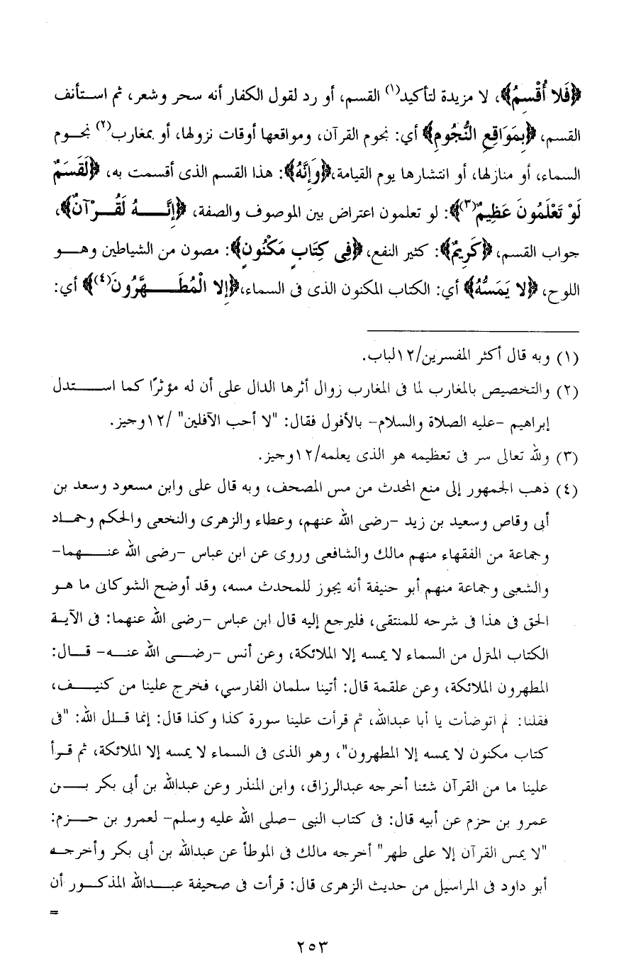 (فَلَا أُقْسِمُ)، لا مزيدة لتأكيد القسم، أو رد لقول الكفار أنه سحر وشعر، ثم استأنف القسم، (بِمَوَاقِعِ النُّجُومِ) أي: نجوم القرآن، ومواقعها أوقات نزولها، أو بمغارب نجوم السماء، أو منازلها، أو انتشارها يوم القيامة، (وَإِنَّهُ): هذا القسم الذي أقسمت به، (لَقَسَمٌ لَوْ تَعْلَمُونَ عَظِيمٌ): لو تعلمون اعتراض بين الموصوف والصفة، (إِنَّهُ لَقُرْآنٌ)، جواب القسم، (كَرِيمٌ): كثير النفع، (فِي كِتَابٍ مَكْنُونٍ): مصون من الشياطين وهو اللوح، (لَا يَمَسُّهُ) أي: الكناب المكنون الذي في السماء، (إِلَّا الْمُطَهَّرُونَ) أي: