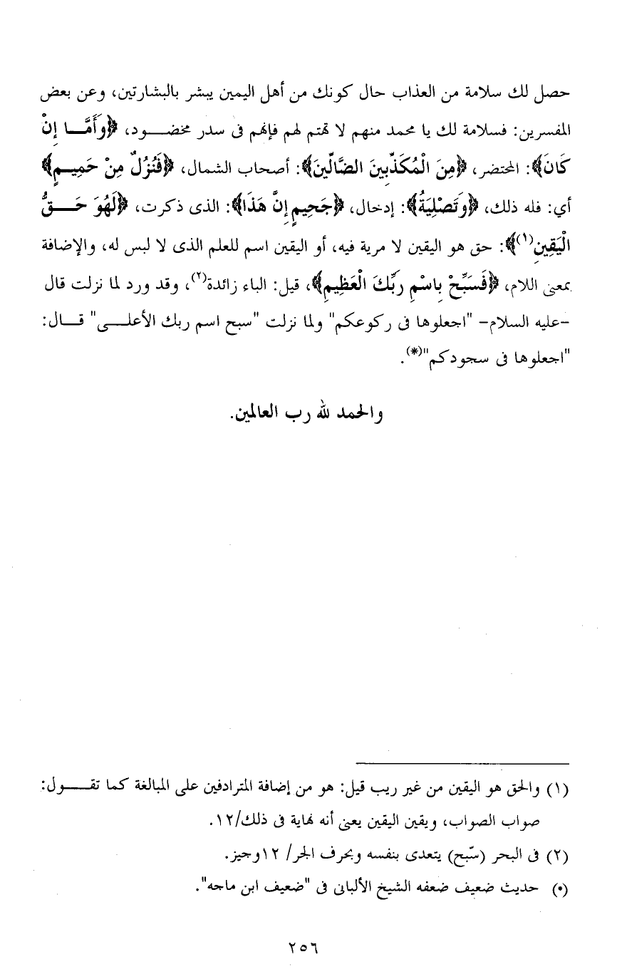 حصل لك سلامة من العذاب حال كونك من أهل اليمين يبشر بالبشارتين، وعن بعض المفسرين: فسلامة لك يا محمد منهم لا تهتم لهم فإنهم في سدر مخضود، (وَأَمَّا إِنْ كَانَ): المحتضر، (مِنَ الْمُكَذِّبِينَ الضَّالِّينَ): أصحاب الشمال، (فَنُزُلٌ مِنْ حَمِيمٍ) أي: فله ذلك، (وَتَصْلِيَةُ): إدخال، (جَحِيمٍ إِنَّ هَذَا): الذي ذكرت، (لَهُوَ حَقُّ الْيَقِينِ): حق هو اليقين لا مرية فيه، أو اليقين اسم للعلم الذي لا لبس له، والإضافة بمعنى اللام، (فَسَبِّحْ بِاسْمِ رَبِّكَ الْعَظِيمِ)، قيل: الباء زائدة، وقد ورد لما نزلت قال - عليه السلام - " اجعلوها في ركوعكم " ولما نزلت " سبح اسم ربِّك الأعلى " قال: " اجعلوها في سجودكم ".