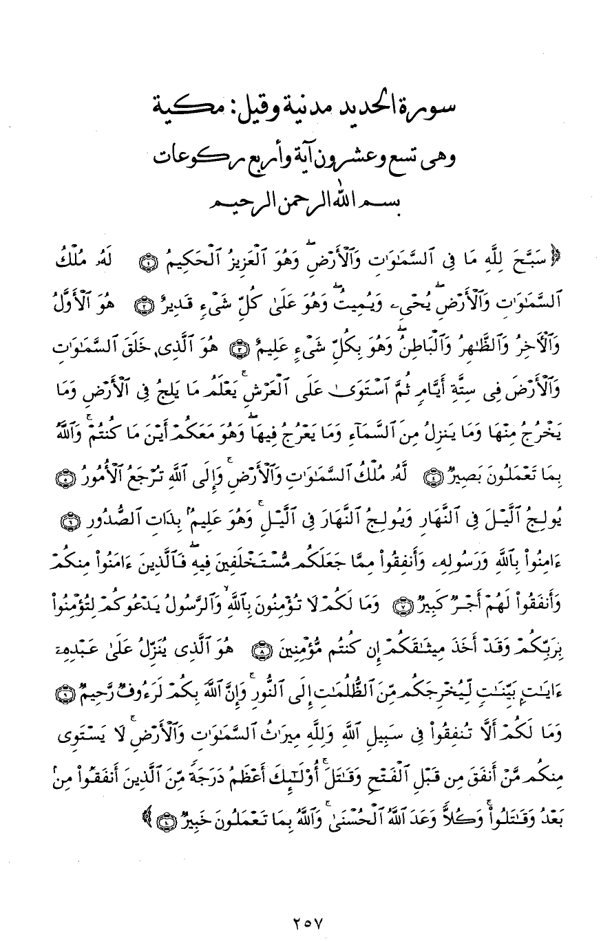 (سَبَّحَ لله مَا فِي السَّمَاوَاتِ وَالْأَرْضِ وَهُوَ الْعَزِيزُ الْحَكِيمُ (1) لَهُ مُلْكُ السَّمَاوَاتِ وَالْأَرْضِ يُحْيِي وَيُمِيتُ وَهُوَ عَلَى كُلِّ شَيْءٍ قَدِيرٌ (2) هُوَ الْأَوَّلُ وَالْآخِرُ وَالظَّاهِرُ وَالْبَاطِنُ وَهُوَ بِكُلِّ شَيْءٍ عَلِيمٌ (3) هُوَ الَّذِي خَلَقَ السَّمَاوَاتِ وَالْأَرْضَ فِي سِتَّةِ أَيَّامٍ ثُمَّ اسْتَوَى عَلَى الْعَرْشِ يَعْلَمُ مَا يَلِجُ فِي الْأَرْضِ وَمَا يَخْرُجُ مِنْهَا وَمَا يَنْزِلُ مِنَ السَّمَاءِ وَمَا يَعْرُجُ فِيهَا وَهُوَ مَعَكُمْ أَيْنَ مَا كُنْتُمْ وَاللهُ بِمَا تَعْمَلُونَ بَصِيرٌ (4) لَهُ مُلْكُ السَّمَاوَاتِ وَالْأَرْضِ وَإِلَى اللهِ تُرْجَعُ الْأُمُورُ (5) يُولِجُ اللَّيْلَ فِي النَّهَارِ وَيُولِجُ النَّهَارَ فِي اللَّيْلِ وَهُوَ عَلِيمٌ بِذَاتِ الصُّدُورِ (6) آمِنُوا بِاللهِ وَرَسُولِهِ وَأَنْفِقُوا مِمَّا جَعَلَكُمْ مُسْتَخْلَفِينَ فِيهِ فَالَّذِينَ آمَنُوا مِنْكُمْ وَأَنْفَقُوا لَهُمْ أَجْرٌ كَبِيرٌ (7) وَمَا لَكُمْ لَا تُؤْمِنُونَ بِاللهِ وَالرَّسُولُ يَدْعُوكُمْ لِتُؤْمِنُوا بِرَبِّكُمْ وَقَدْ أَخَذَ مِيثَاقَكُمْ إِنْ كُنْتُمْ مُؤْمِنِينَ (8) هُوَ الَّذِي يُنَزِّلُ عَلَى عَبْدِهِ آيَاتٍ بَيِّنَاتٍ لِيُخْرِجَكُمْ مِنَ الظُّلُمَاتِ إِلَى النُّورِ وَإِنَّ اللهَ بِكُمْ لَرَءُوفٌ رَحِيمٌ (9) وَمَا لَكُمْ أَلَّا تُنْفِقُوا فِي سَبِيلِ اللهِ وَلله مِيرَاثُ السَّمَاوَاتِ وَالْأَرْضِ لَا يَسْتَوِي مِنْكُمْ مَنْ أَنْفَقَ مِنْ قَبْلِ الْفَتْحِ وَقَاتَلَ أُولَئِكَ أَعْظَمُ دَرَجَةً مِنَ الَّذِينَ أَنْفَقُوا مِنْ بَعْدُ وَقَاتَلُوا وَكُلًّا وَعَدَ اللهُ الْحُسْنَى وَاللهُ بِمَا تَعْمَلُونَ خَبِيرٌ (10)