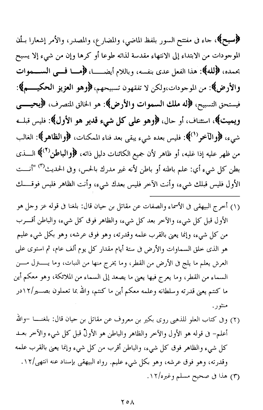 (سَبَّحَ)، جاء في مفتتح السور بلفظ الماضي، والمضارع، والمصدر، والأمر إشعارًا بأن الموجودات من الابتداء إلى الانتهاء مقدسة لذاته طوعًا أو كرهًا (وَإِنْ مِنْ شَيْءٍ إِلَّا يُسَبِّحُ بِحَمْدِهِ)، (لله): هذا الفعل عدى بنفسه، وباللام أيضًا، (ما في السَّمَاوَات والأرضِ): من الموجودات، ولكن لا تفقهون تسبيحهم، (وهو العزيز الحكيم): فيستحق التسبيح، (له ملك السَّمَاوَاتِ وَالْأَرْضِ): هو الخالق المتصرف، (يُحْيِي وَيُمِيتُ)، استئناف، أو حال، (وَهُوَ عَلَى كُلِّ شَيْءٍ قَدِيرٌ هُوَ الْأَوَّلُ): فليس قبله شيء، (وَالْآخِرُ): فليس بعده شيء يبقى بعد فناء الممكنات، (وَالظَّاهِرُ): الغالب من ظهر عليه إذا غلبه، أو ظاهر لأن جميع الكائنات دليل ذاته، (وَالْبَاطِنُ) الذي بطن كل شيء أي: علم باطنه أو باطن لأنه غير مدرك بالحس، وفي الحديث " أنت الأول فليس قبلك شيء، وأنت الآخر فليس بعدك شيء، وأنت الظاهر فليس فوقك