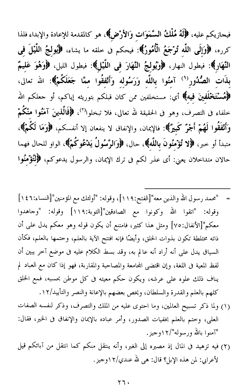فيجازيكم عليه، (لَهُ مُلْكُ السَّمَاوَاتِ وَالْأَرْضِ)، هو كالمقدمة للإعادة والإبداء فلذا كرره، (وَإِلَى اللهِ تُرْجَعُ الأمُورُ): َ فيحكم في خلقه ما يشاء، (يُولِجُ اللَّيْلَ فِي النَّهَارِ): فيطول النهار، (وَيُولِجُ النَّهَارَ فِي اللَّيْلِ): فيطول الليل، (وَهُوَ عَلِيمٌ بذَاتِ الصُّدُورِ آمِنُوا بِاللهِ وَرَسُولِهِ وَأَنفِقُوا مِمَّا جَعَلَكُمْ): الله تعالى، (مُسْتَخْلَفِينَ فِيهِ) أي: مستخلفين ممن كان قبلكم بتوريثه إياكم، أو جعلكم الله خلفاء في التصرف، وهو في الحقيقة لله تعالى، فلا تبخلوا، (فَالَّذِينَ آمَنُوا مِنْكُمْ وَأَنْفَقُوا لَهُمْ أَجْرٌ كَبِيرٌ): فالإيمان، والإنفاق لا ينفعان إلا أنفسكم، (وَمَا لَكُمْ)، متبدًا أو خبر، (لا تُؤْمِنُونَ بِاللهِ)، حال، (وَالرَّسُولُ يَدْعُوكُمْ)، الواو للحال فهما، حالان متداخلان يعني: أي عذر لكم في ترك الإيمان، والرسول يدعوكم، (لِتُؤْمِنُوا