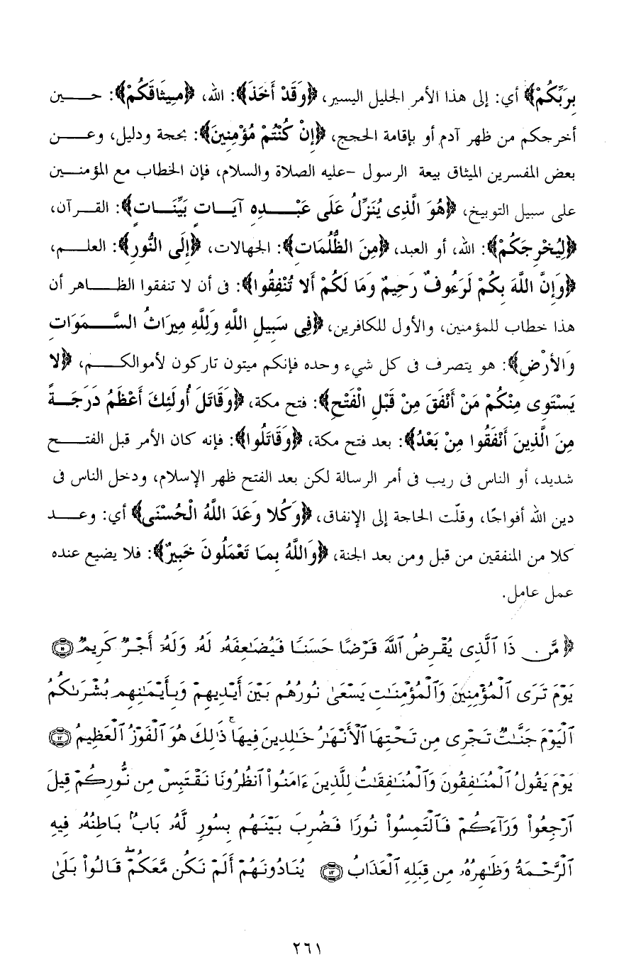 بِرَبِّكُمْ) أي: إلى هذا الأمر الجليل اليسير، (وَقَدْ أَخَذَ): الله، (مِيثَاقَكُمْ): حين أخرجكم من ظهر آدم أو بإقامة الحجج، (إِنْ كُنْتُمْ مُؤْمِنِينَ): بحجة ودليل، وعن بعض المفسرين الميثاق بيعة الرسول - عليه الصلاة والسلام، فإن الخطاب مع المؤمنين على سبيل التوبيخ، (هُوَ الَّذِي يُنَزِّلُ عَلَى عَبْدِهِ آيَاتٍ بَيِّنَاتٍ): القرآن، (لِيُخْرِجَكُمْ): الله، أو العبد، (مِنَ الظلُمَاتِ): الجهالات، (إِلَى النُّورِ): العلم، (وَإِنَّ اللهَ بِكُمْ لَرَءُوفٌ رَحِيمٌ وَمَا لَكُمْ أَلَّا تُنْفِقُوا): في أن لا تنفقوا الظاهر أن هذا خطاب للمؤمين، والأول للكافرين، (فِي سَبِيلِ اللهِ وَلله مِيرَاثُ السَّمَاوَاتِ وَالْأَرْضِ): هو يتصرف في كل شيء وحده فإنكم ميتون تاركون لأموالكم، (لَا يَسْتَوِي مِنْكُمْ مَنْ أَنْفَقَ مِنْ قَبْلِ الْفَتْحِ): فتح مكة، (وَقَاتَلَ أُولَئِكَ أَعْظَمُ دَرَجَةً مِنَ الَّذِينَ أَنْفَقُوا مِنْ بَعْدُ): بعد فتح مكة، (وَقَاتَلُوا): فإنه كان الأمر قبل الفتح شديد، أو الناس في ريب في أمر الرسالة لكن بعد الفتح ظهر الإسلام، ودخل الناس في دين الله أفواجًا، وققت الحاجة إلى الإنفاق، (وَكُلًّا وَعَدَ اللهُ الْحُسْنَى) أي: وعد كلاً من النفقين من قبل ومن بعد الجنة، (وَاللهُ بِمَا تَعْمَلُونَ خَبِيرٌ): فلا يضيع عنده عمل عامل.