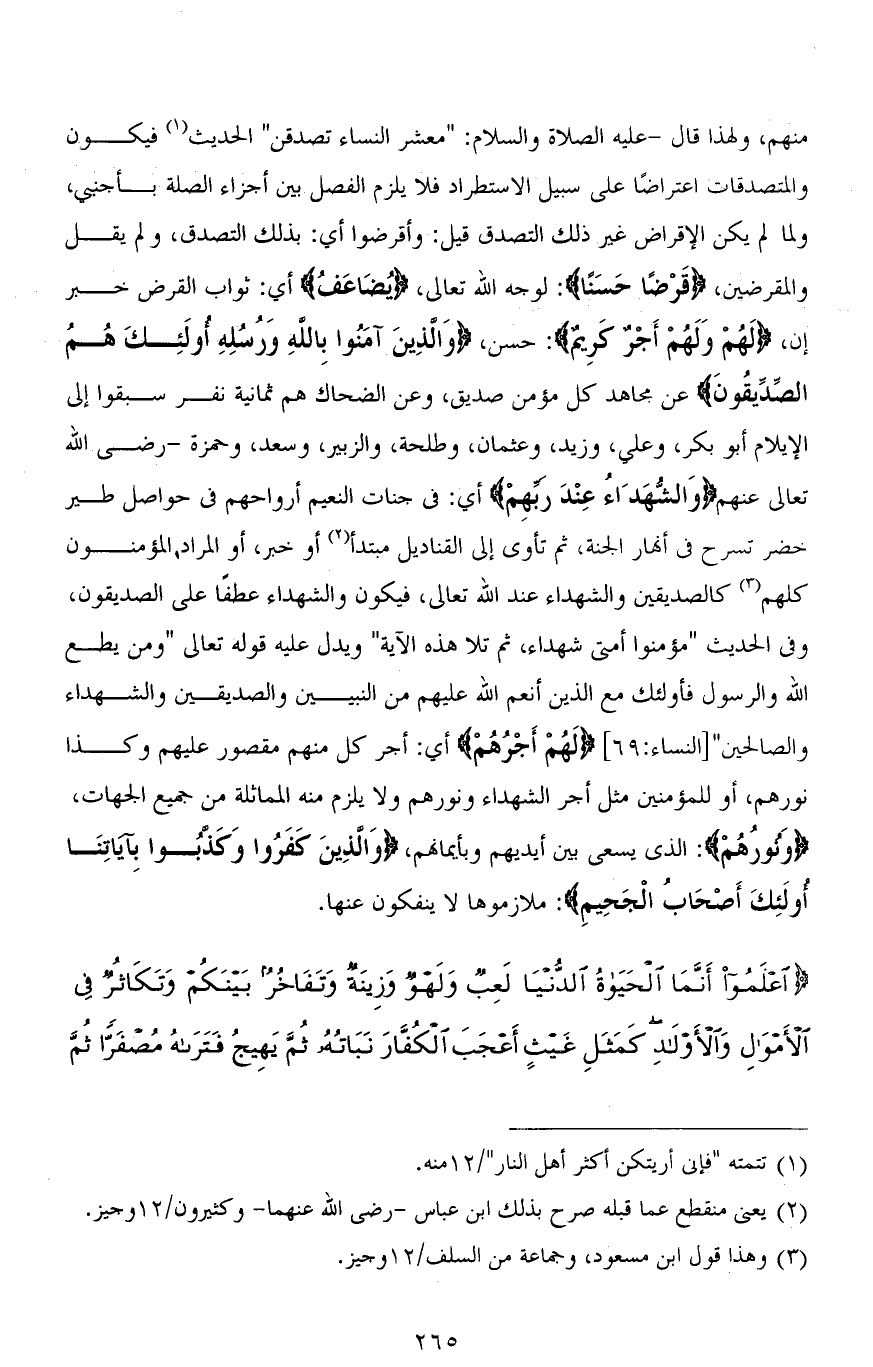 منهم، ولهذا قال - عليه الصلاة والسلام: " معشر النساء تصدقن " الحديث فيكون والمتصدقات اعتراضًا على سبيل الاستطراد فلا يلزم الفصل بين أجزاء الصلة بأجنبي، ولما لم يكن الإقراض غير ذلك التصدق قيل: وأقرضوا أي: بذلك التصدق، ولم يقل والقرضين، (قَرْضًا حَسَنًا): لوجه الله تعالى، (يُضَاعَفُ) أي: ثواب القرض خبر إن، (لَهُمْ وَلَهُمْ أَجْرٌ كَرِيمٌ): حسن، (وَالَّذِينَ آمَنُوا بِاللهِ وَرُسُلِهِ أُولَئِكَ هُمُ الصِّدِّيقُونَ) عن مجاهد كل مؤمن صديق، وعن الضحاك هم ثمانية نفر سبقوا إلى [الإسلام] أبو بكر، وعلي، وزيد، وعثمان، وطلحة، والزبير، وسعد، وحمزة - رضي الله تعالى عنهم (وَالشُّهَدَاءُ عِنْدَ رَبِّهِمْ) أي: في جنات النعيم أرواحهم في حواصل طير خضر تسرح في أنهار الجنة، ثم تأوى إلى القناديل مبتدأ أو خبر، أو المراد، المؤمنون كلهم كالصديقين والشهداء عند الله تعالى، فيكون والشهداء عطفًا على الصديقون، وفي الحديث " مؤمنوا أمتي شهداء، ثم تلا هذه الآية " ويدل عليه قوله تعالى (وَمَنْ يُطِعِ اللهَ وَالرَّسُولَ فَأُولَئِكَ مَعَ الَّذِينَ أَنْعَمَ اللهُ عَلَيْهِمْ مِنَ النَّبِيِّينَ وَالصِّدِّيقِينَ وَالشُّهَدَاءِ وَالصَّالِحِينَ) [النساء: 69] (لَهُمْ أَجْرُهُمْ) أي: أجر كل منهم مقصور عليهم وكذا نورهم، أو للمؤمنين مثل أجر الشهداء ونورهم ولا يلزم منه المماثلة من جميع الجهات، (وَنورُهُمْ): الذي يسعى بين أيديهم وبأيمانهم، (وَالَّذِينَ كَفَرُوا وَكَذبُوا بِآيَاتِنَا أُولَئِكَ أَصْحَابُ الْجَحِيمِ): ملازموها لا ينفكون عنها.