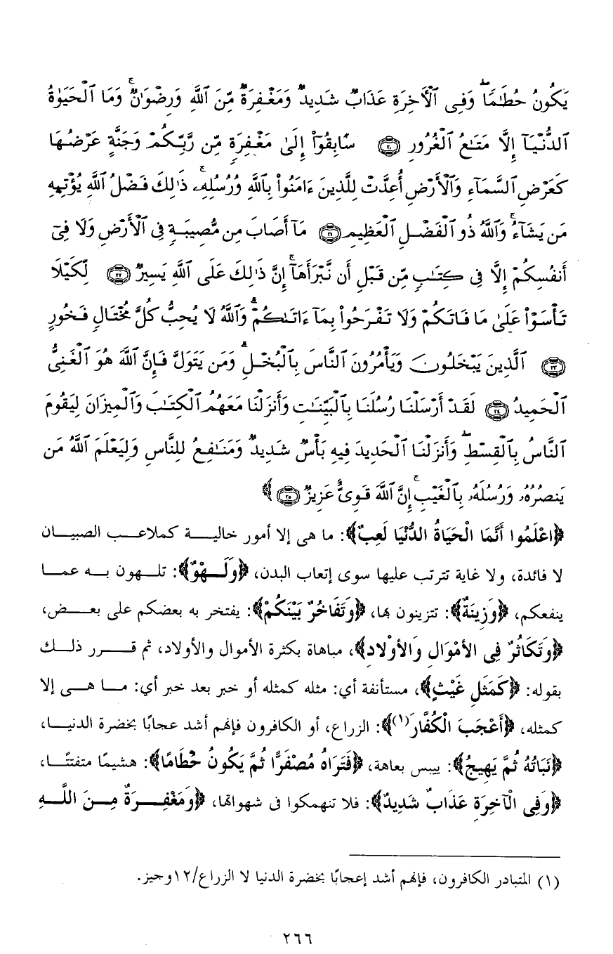 يَكُونُ حُطَامًا وَفِي الْآخِرَةِ عَذَابٌ شَدِيدٌ وَمَغْفِرَةٌ مِنَ اللهِ وَرِضْوَانٌ وَمَا الْحَيَاةُ الدُّنْيَا إِلَّا مَتَاعُ الْغُرُورِ (20) سَابِقُوا إِلَى مَغْفِرَةٍ مِنْ رَبِّكُمْ وَجَنَّةٍ عَرْضُهَا كَعَرْضِ السَّمَاءِ وَالْأَرْضِ أُعِدَّتْ لِلَّذِينَ آمَنُوا بِاللهِ وَرُسُلِهِ ذَلِكَ فَضْلُ اللهِ يُؤْتِيهِ مَنْ يَشَاءُ وَاللهُ ذُو الْفَضْلِ الْعَظِيمِ (21) مَا أَصَابَ مِنْ مُصِيبَةٍ فِي الْأَرْضِ وَلَا فِي أَنْفُسِكُمْ إِلَّا فِي كِتَابٍ مِنْ قَبْلِ أَنْ نَبْرَأَهَا إِنَّ ذَلِكَ عَلَى اللهِ يَسِيرٌ (22) لِكَيْلَا تَأْسَوْا عَلَى مَا فَاتَكُمْ وَلَا تَفْرَحُوا بِمَا آتَاكُمْ وَاللهُ لَا يُحِبُّ كُلَّ مُخْتَالٍ فَخُورٍ (23) الَّذِينَ يَبْخَلُونَ وَيَأْمُرُونَ النَّاسَ بِالْبُخْلِ وَمَنْ يَتَوَلَّ فَإِنَّ اللهَ هُوَ الْغَنِيُّ الْحَمِيدُ (24) لَقَدْ أَرْسَلْنَا رُسُلَنَا بِالْبَيِّنَاتِ وَأَنْزَلْنَا مَعَهُمُ الْكِتَابَ وَالْمِيزَانَ لِيَقُومَ النَّاسُ بِالْقِسْطِ وَأَنْزَلْنَا الْحَدِيدَ فِيهِ بَأْسٌ شَدِيدٌ وَمَنَافِعُ لِلنَّاسِ وَلِيَعْلَمَ اللهُ مَنْ يَنْصُرُهُ وَرُسُلَهُ بِالْغَيْبِ إِنَّ اللهَ قَوِيٌّ عَزِيزٌ (25)