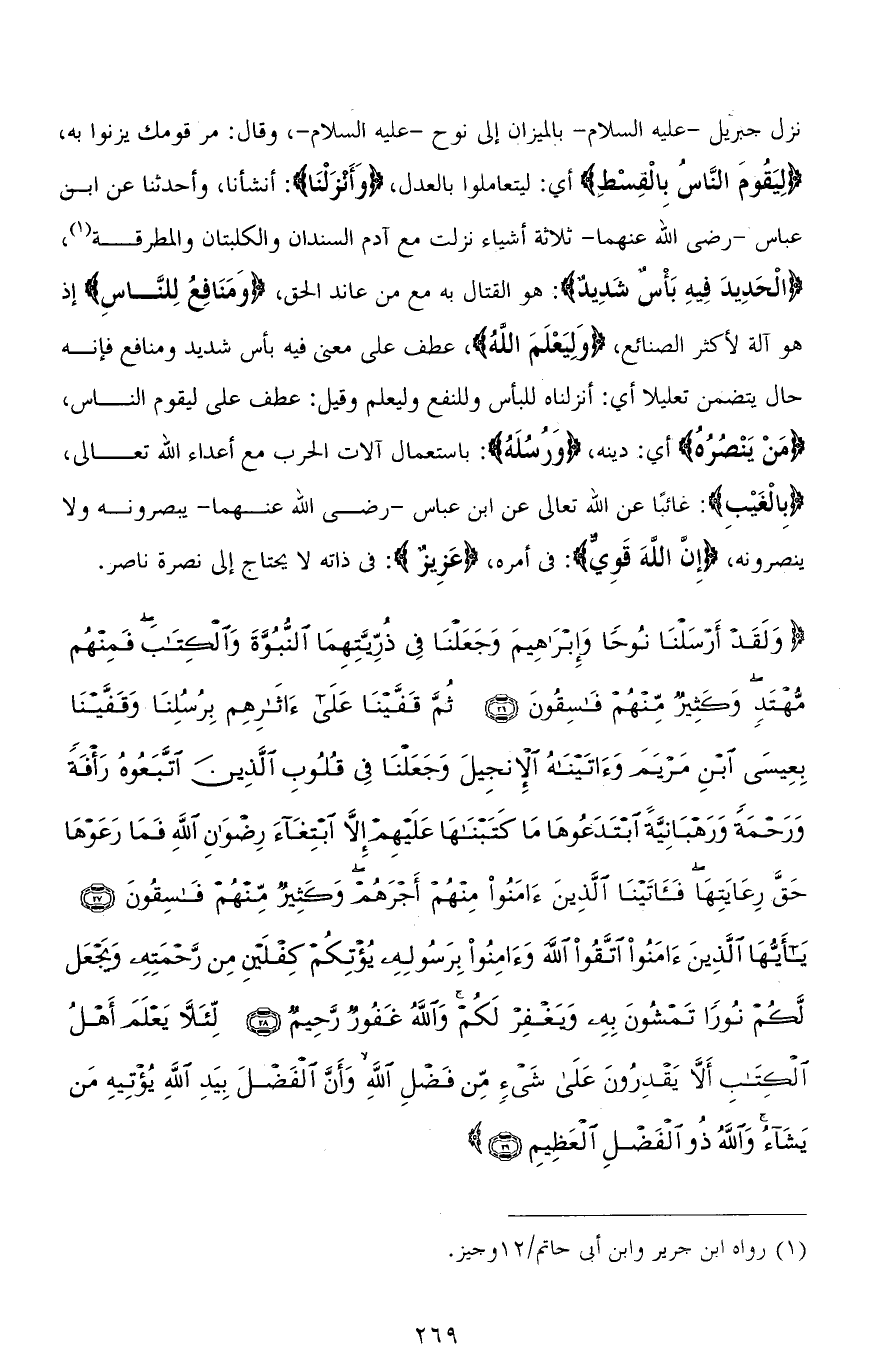 نزل جبريل - عليه السلام - بالميزان إلى نوح - عليه السلام -، وقال: مُرْ قومك يزنوا به، (لِيَقُومَ النَّاسُ بالْقِسْطِ) أي: ليتعاملوا بالعدل، (وَأَنْزَلْنَا): أنشأنا، وأحدثنا عن ابن عباس - رضي الله عنهما - ثلاثة أشياء نزلت مع آدم السندان والكلبتان والمطرقة، (الْحَدِيدَ فِيهِ بَأْس شَدِيدٌ): هو القتال به مع من عاند الحق، (وَمَنَافِعُ لِلنَّاسِ) إذ هو آلة لأكثر الصنائع، (وَلِيَعْلَمَ اللهُ)، عطف على معنى فيه بأس شديد ومنافع فإنه حال يتضمن تعليلاً أي: أنزلناه للبأس وللنفع وليعلم وقيل: عطف على ليقوم الناس، (مَنْ يَنْصُرُهُ) أي: دينه، (وَرُسُلَهُ): باستعمال آلات الحرب مع أعداء الله تعالى، (بِالْغَيْب): غائبًا عن الله تعالى عن ابن عباس - رضي الله عنهما - يبصرونه ولا ينصرونه، (إِنَّ اللهَ قَوِيٌّ): في أمره، (عَزِيزٌ): في ذاته لا يحتاج إلى نصرة ناصر.