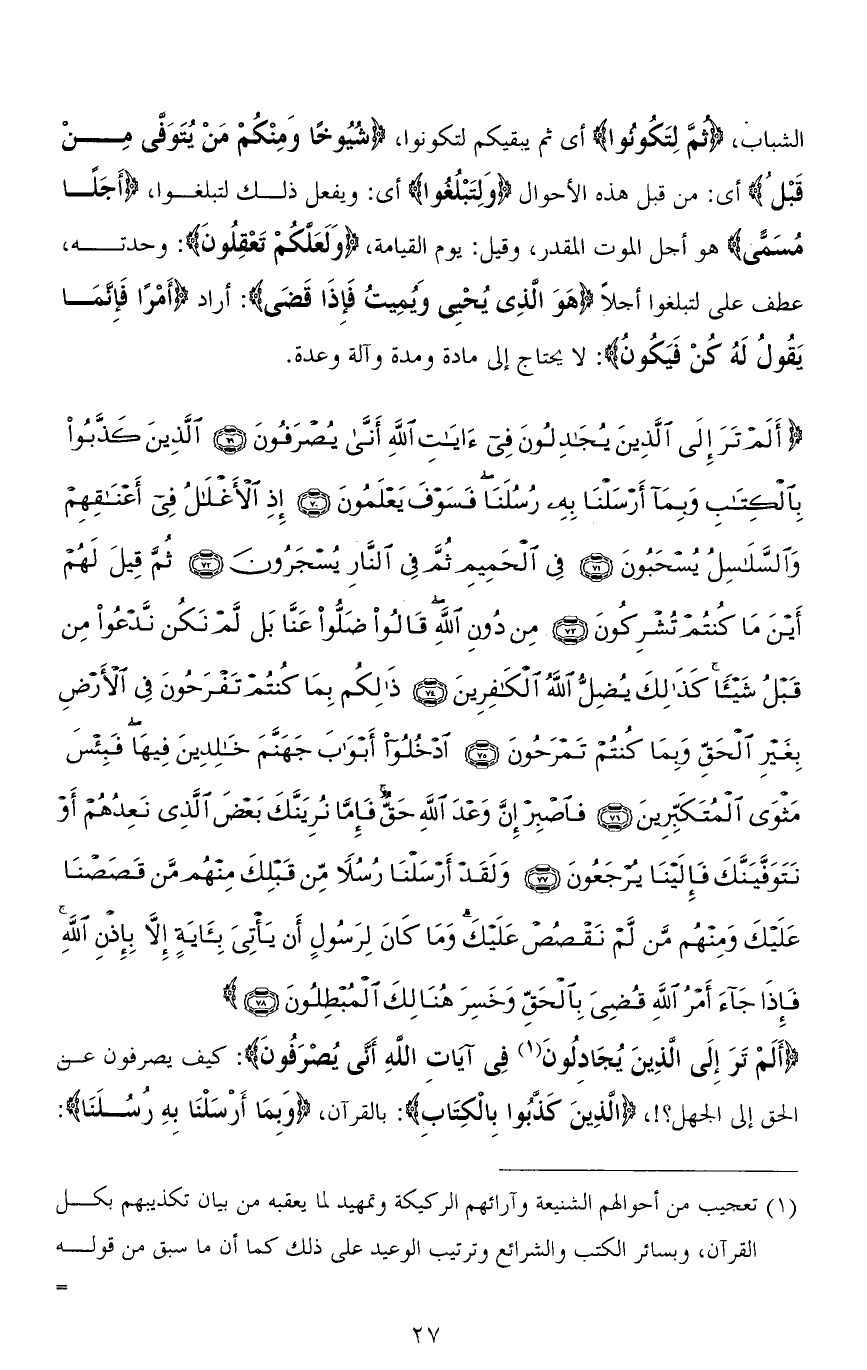 (أَلَمْ تَرَ إِلَى الَّذِينَ يُجَادِلُونَ فِي آيَاتِ اللهِ أَنَّى يُصْرَفُونَ (69) الَّذِينَ كَذَّبُوا بِالْكِتَابِ وَبِمَا أَرْسَلْنَا بِهِ رُسُلَنَا فَسَوْفَ يَعْلَمُونَ (70) إِذِ الْأَغْلَالُ فِي أَعْنَاقِهِمْ وَالسَّلَاسِلُ يُسْحَبُونَ (71) فِي الْحَمِيمِ ثُمَّ فِي النَّارِ يُسْجَرُونَ (72) ثُمَّ قِيلَ لَهُمْ أَيْنَ مَا كُنْتُمْ تُشْرِكُونَ (73) مِنْ دُونِ اللهِ قَالُوا ضَلُّوا عَنَّا بَلْ لَمْ نَكُنْ نَدْعُو مِنْ قَبْلُ شَيْئًا كَذَلِكَ يُضِلُّ اللهُ الْكَافِرِينَ (74) ذَلِكُمْ بِمَا كُنْتُمْ تَفْرَحُونَ فِي الْأَرْضِ بِغَيْرِ الْحَقِّ وَبِمَا كُنْتُمْ تَمْرَحُونَ (75) ادْخُلُوا أَبْوَابَ جَهَنَّمَ خَالِدِينَ فِيهَا فَبِئْسَ مَثْوَى الْمُتَكَبِّرِينَ (76) فَاصْبِرْ إِنَّ وَعْدَ اللهِ حَقٌّ فَإِمَّا نُرِيَنَّكَ بَعْضَ الَّذِي نَعِدُهُمْ أَوْ نَتَوَفَّيَنَّكَ فَإِلَيْنَا يُرْجَعُونَ (77) وَلَقَدْ أَرْسَلْنَا رُسُلًا مِنْ قَبْلِكَ مِنْهُمْ مَنْ قَصَصْنَا عَلَيْكَ وَمِنْهُمْ مَنْ لَمْ نَقْصُصْ عَلَيْكَ وَمَا كَانَ لِرَسُولٍ أَنْ يَأْتِيَ بِآيَةٍ إِلَّا بِإِذْنِ اللهِ فَإِذَا جَاءَ أَمْرُ اللهِ قُضِيَ بِالْحَقِّ وَخَسِرَ هُنَالِكَ الْمُبْطِلُونَ (78)