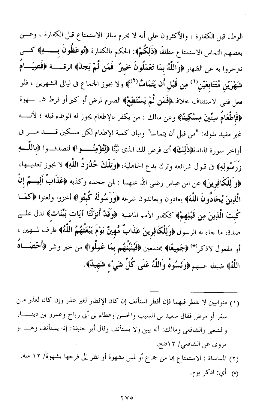 الوطء قبل الكفارة، والأكثرون على أنه لا يحرم سائر الاستمتاع قبل الكفارة، وعن بعضهم التماس الاستمتاع مطلقًا (ذَلِكُمْ): الحكم بالكفارة (توعَظُونَ بِهِ) كي تنزجروا به عن الظهار (وَاللهُ بِمَا تَعْمَلُونَ خَبِيرٌ فَمَن لَمْ يَجدْ) الرقبة (فَصِيَامُ شَهْرَيْنِ مُتَتَابِعَيْنِ مِن قَبْلِ أَن يَتَمَاسَّا) ولا يجوز الجماع في ليالي الشهرين، فلو فعل ففي الاستئناف خلاف (فَمَنْ لَمْ يَسْتَطِعْ) الصوم لمرض أو كبر أو فرط شهوة (فَإِطْعَامُ سِتِّينَ مِسْكِينًا) وعن مالك: من يكفر بالإطعام يجوز له الوطء قبله؛ لأنه غير مقيد بقوله: (مِنْ قَبْلِ أَنْ يَتَمَاسَّا) وبيان كمية الإطعام لكل مسكين قد مر في أواخر سورة المائدة (ذلِكَ) أي فرض لك الذي بَيَّنَّا (لتُؤْمِئُوا) لتصدقوا (بِالله وَرَسولِهِ) في قبول شرائعه وترك بدع الجاهلية، (وَتِلْكَ حُدُودُ اللهِ) لا يجوز تعديها، (وَلِلْكَافرِينَ) عن ابن عباس رضي الله عنهما: لمن جحده وكذبه (عَذَابٌ أَلِيمٌ إِنَّ الَّذِينَ يُحَادُّونَ اللهَ) يعادون ويعاندون شرعه (وَرَسُولَهُ كُبِتُوا) أخزوا ولعنوا (كَمَا كُبِتَ الَّذِينَ مِنْ قَبْلِهِمْ) ككفار الأمم الماضية (وَقَدْ أَنْزَلْنَا آيَاتٍ بَيِّنَاتٍ) تدل على صدق ما جاء به الرسول (وَلِلْكَافِرِينَ عَذَابٌ مُهِينٌ يَوْمَ يَبْعَثُهُمُ اللهُ) ظرف لـ مهين، أو مفعول لـ اذكر (جَمِيعًا) مجتمعين (فَيُنَبِّئُهُمْ بِمَا عَمِلُوا) من خير وشر (أَحْصَاهُ اللهُ) ضبطه عليهم (وَنَسُوهُ وَاللهُ عَلَى كُلِّ شَيْءٍ شَهِيدٌ).