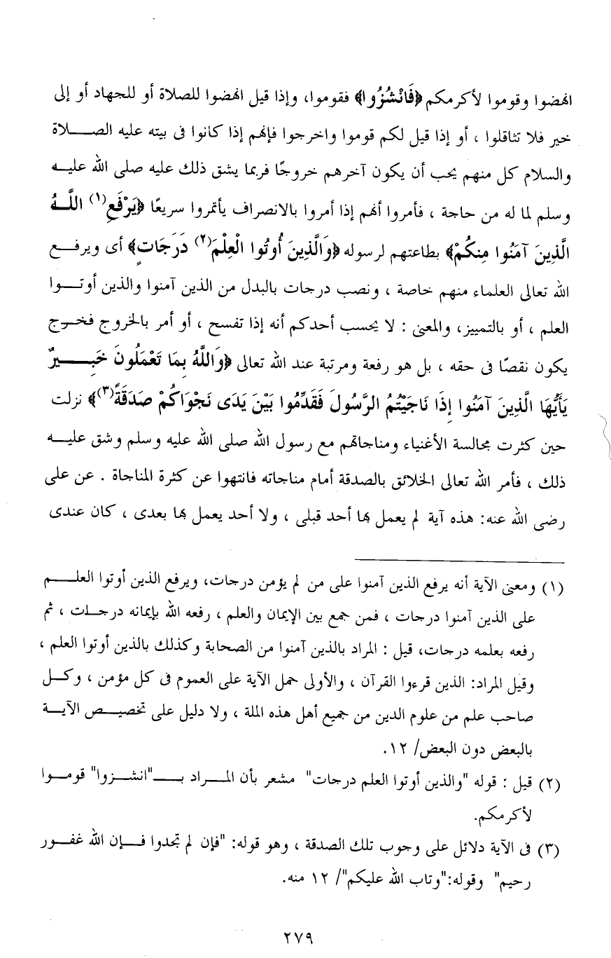انهضوا وقوموا لأكرمكم (فَانْشُزُوا) فقوموا، وإذا قيل انهضوا للصلاة أو للجهاد أو إلى خير فلا تثاقلوا، أو إذا قيل لكم قوموا واخرجوا فإنَّهم إذا كانوا في بيته عليه الصلاة والسلام كل منهم يحب أن يكون آخرهم خروجًا فربما يشق ذلك عليه صلى الله عليه وسلم لما له من حاجة، فأمروا أنَّهم إذا أمروا بالانصراف يأتمروا سريعًا (يَرْفَعِ اللهُ الَّذِينَ آمَنُوا مِنْكُمْ) بطاعتهم لرسوله (وَالَّذِينَ أُوتُوا الْعِلْمَ دَرَجَاتٍ) أي ويرفع الله تعالى العلماء منهم خاصة، ونصب درجات بالبدل من الذين آمنوا والذين أوتوا العلم، أو بالتمييز، والمعنى: لا يحسب أحدكم أنه إذا تفسح، أو أمر بالخروج فخرج يكون نقصًا في حقه، بل هو رفعة ومرتبة عند الله تعالى (وَاللهُ بِمَا تَعْمَلُونَ خَبِيرٌ يَا أَيُّهَا الَّذِينَ آمَنُوا إِذَا نَاجَيْتُمُ الرَّسُولَ فَقَدِّمُوا بَيْنَ يَدَيْ نَجْوَاكُمْ صَدَقَةً) نزلت حين كثرت مجالسة الأغنياء ومناجاتهم مع رسول الله صلى الله عليه وسلم وشق عليه ذلك، فأمر الله تعالى الخلائق بالصدقة أمام مناجاته فانتهوا عن كثرة المناجاة. عن علي رضي الله عنه: هذه آية لم يعمل بها أحد قبلي، ولا أحد يعمل بها بعدي، كان عندي
