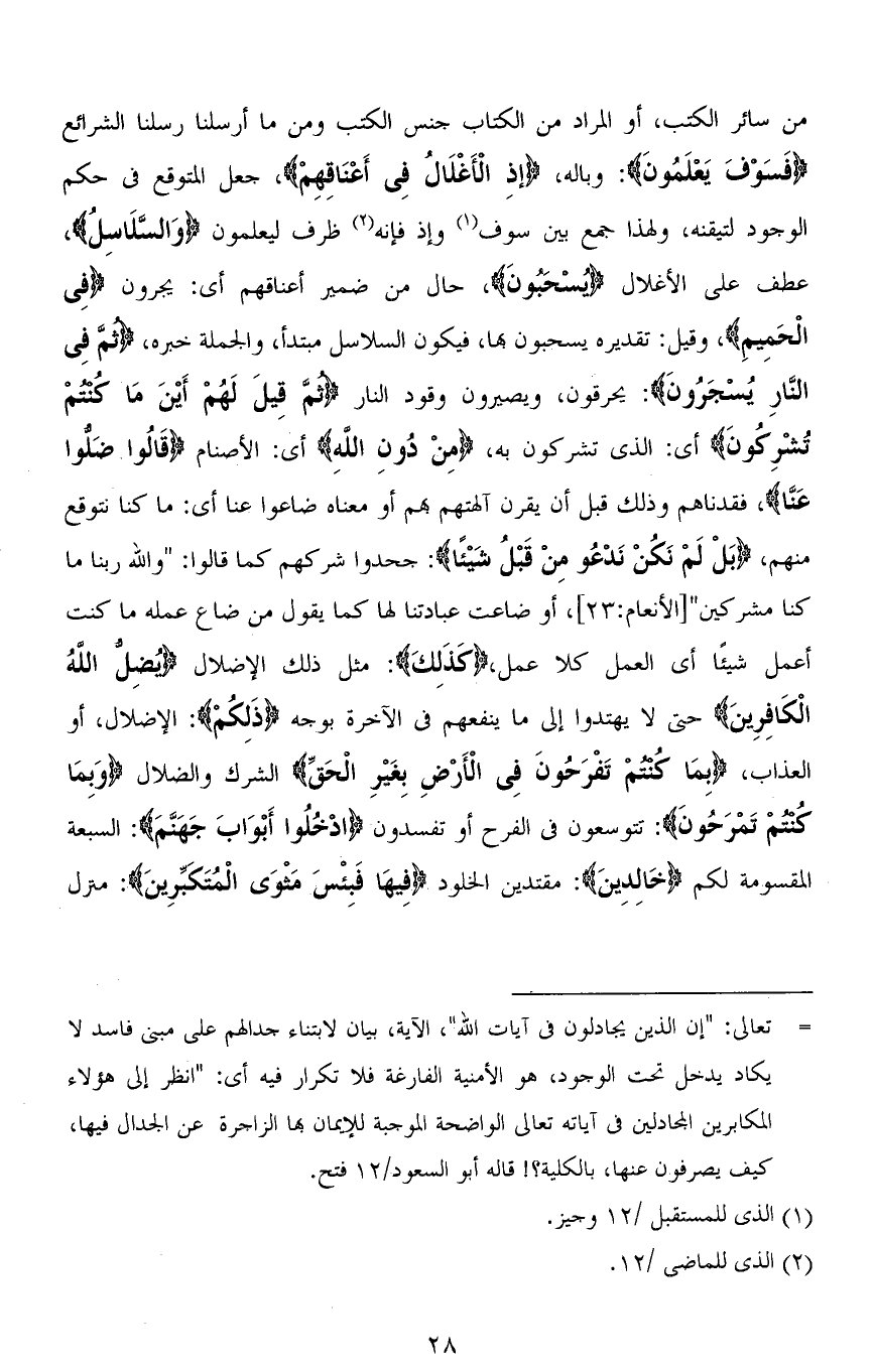 من سائر الكتب، أو المراد من الكتاب جنس الكتب ومن ما أرسلنا رسلنا الشرائع (فَسَوْفَ يَعلَمُونَ): وباله، (إذِ الْأَغلَالُ فِي أَعْنَاقِهِمْ)، جعل المتوقع في حكم الموجود لتيقنه، ولهذا جمع بين سوف وإذ فإنه ظرف ليعلمون (وَالسَّلَاسِلُ)، عطف على الأغلال (يُسْحَبُونَ)، حال من ضمير أعناقهم أي: يجرون (فِي الْحَمِيمِ)، وقيل: تقديره يسحبون بها، فيكون السلاسل مبتدأ، والجملة خبره، (ثُمَّ فِي النَّارِ يُسْجَرُونَ): يحرقون، ويصيرون وقود النار (ثُمَّ قِيلَ لَهُمْ أَيْنَ مَا كُنْتُمْ تُشْرِكُونَ) أي: الذي تشركون به، (مِنْ دُونِ اللهِ) أي: الأصنام (قَالُوا ضَلُّوا عَنَّا)، فقدناهم وذلك قبل أن يقرن آلهتهم بهم أو معناه ضاعوا عنا أي: ما كنا نتوقع منهم، (بَلْ لَمْ نَكُنْ نَدْعُو مِنْ قَبْلُ شَيْئًا): جحدوا شركهم كما قالوا: (وَاللهِ رَبِّنَا مَا كُنَّا مُشْرِكِينَ) [الأنعام: 23]، أو ضاعت عبادتنا لها كما يقول من ضاع عمله ما كنت أعمل شيئًا أي العمل كلا عمل، (كَذلِكَ): مثل ذلك الإضلال (يُضِلُّ اللهُ الْكَافِرِينَ) حتى لا يهتدوا إلى ما ينفعهم في الآخرة بوجه (ذَلِكُمْ): الإضلال، أو العذاب، (بِمَا كُنْتُمْ تَفْرَحُونَ فِي الْأَرْضِ بِغَيْرِ الْحَقِّ) الشرك والضلال (وَبِمَا كُنتمْ تَمْرَحونَ): تتوسعون في الفرح أو تفسدون (ادْخُلُوا أَبْوَابَ جَهَنَّمَ): السبعة المقسومة لكم (خَالِدِينَ): [مقدرين] الخلود (فِيهَا فَبِئْسَ مَثْوَى الْمُتَكَبِّرِينَ): منزل