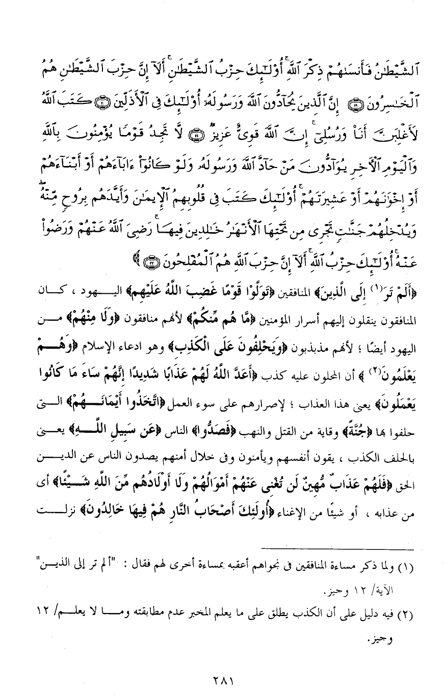 الشَّيْطَانُ فَأَنْسَاهُمْ ذِكْرَ اللهِ أُولَئِكَ حِزْبُ الشَّيْطَانِ أَلَا إِنَّ حِزْبَ الشَّيْطَانِ هُمُ الْخَاسِرُونَ (19) إِنَّ الَّذِينَ يُحَادُّونَ اللهَ وَرَسُولَهُ أُولَئِكَ فِي الْأَذَلِّينَ (20) كَتَبَ اللهُ لَأَغْلِبَنَّ أَنَا وَرُسُلِي إِنَّ اللهَ قَوِيٌّ عَزِيزٌ (21) لَا تَجِدُ قَوْمًا يُؤْمِنُونَ بِاللهِ وَالْيَوْمِ الْآخِرِ يُوَادُّونَ مَنْ حَادَّ اللهَ وَرَسُولَهُ وَلَوْ كَانُوا آبَاءَهُمْ أَوْ أَبْنَاءَهُمْ أَوْ إِخْوَانَهُمْ أَوْ عَشِيرَتَهُمْ أُولَئِكَ كَتَبَ فِي قُلُوبِهِمُ الْإِيمَانَ وَأَيَّدَهُمْ بِرُوحٍ مِنْهُ وَيُدْخِلُهُمْ جَنَّاتٍ تَجْرِي مِنْ تَحْتِهَا الْأَنْهَارُ خَالِدِينَ فِيهَا رَضِيَ اللهُ عَنْهُمْ وَرَضُوا عَنْهُ أُولَئِكَ حِزْبُ اللهِ أَلَا إِنَّ حِزْبَ اللهِ هُمُ الْمُفْلِحُونَ (22)