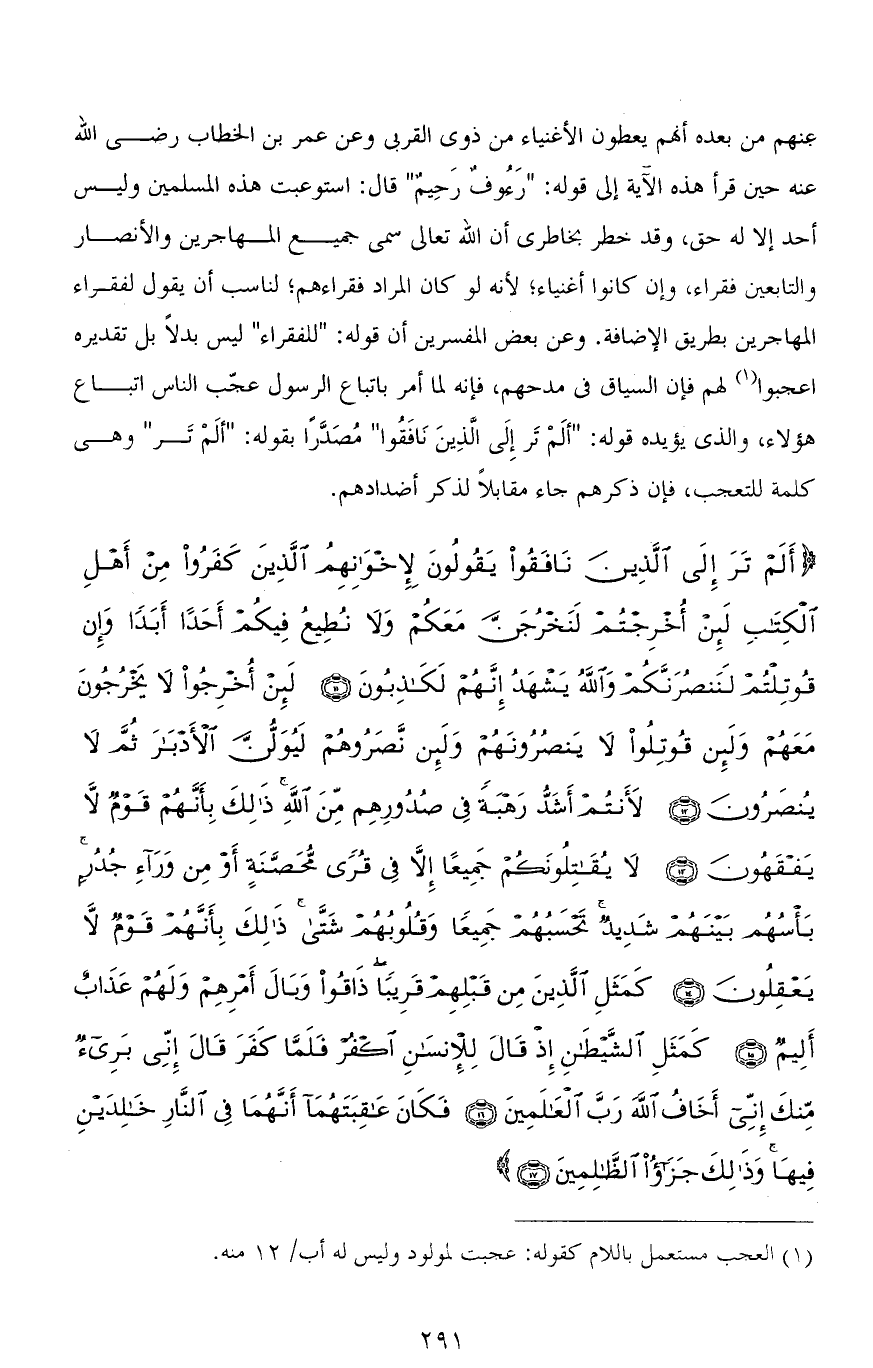 من بعده أنهم يعطون الأغنياء من ذوي القربى وعن عمر بن الخطاب رضي الله عنه حين قرأ هذه الآية إلى قوله: (رَءُوفٌ رَحِيمٌ) قال: استوعبت هذه المسلمين وليس أحد إلا له حق، وقد خطر بخاطري أن الله تعالى سمى جميع المهاجرين والأنصار والتابعين فقراء، وإن كانوا أغنياء؛ لأنه لو كان المراد فقراءهم؛ لناسب أن يقول لفقراء المهاجرين بطريق الإضافة. وعن بعض المفسرين أن قوله: " للفقراء " ليس بدلاً بل تقديره اعجبوا لهم فإن السياق في مدحهم، فإنه لما أمر باتباع الرسول - صلى الله عليه وسلم - عجّب الناس اتباع هؤلاء، والذي يؤيده قوله: " ألَمْ تَر إِلَى الَّذِينَ نَافَقُوا " مُصَدَّرًا بقوله: " ألَمْ تَر " وهي كلمة للتعجب، فإن ذكرهم جاء مقابلاً لذكر أضدادهم.