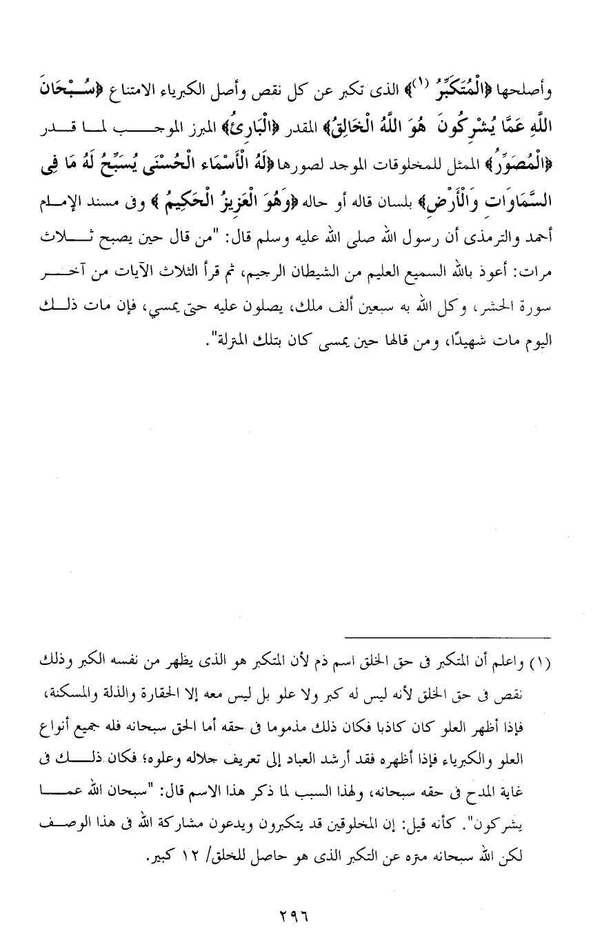 وأصلحها (الْمُتَكَبِّرُ) الذي تكبر عن كل نقص وأصل الكبرياء الامتناع (سُبْحَانَ اللهِ عَمَّا يُشْرِكُونَ هُوَ اللهُ الْخَالِقُ) المقدر (الْبَارِئُ) المبرز الموجب لما قدر (الْمُصَوِّرُ) الممثل للمخلوقات الموجد لصورها (لَهُ الْأَسْمَاءُ الْحُسْنَى يُسَبِّحُ لَهُ مَا فِي السَّمَاوَاتِ وَالْأَرْضِ) بلسان قاله أو حاله (وَهُوَ الْعَزِيزُ الْحَكِيمُ) وفي مسند الإمام أحمد والترمذي أن رسول الله صلى الله عليه وسلم قال: " من قال حين يصبح ثلاث مرات: أعوذ بالله السميع العليم من الشيطان الرجيم، ثم قرأ الثلاث الآيات من آخر سورة الحشر، وكَّلَ الله به سبعين ألف ملك، يصلون عليه حتى يمسى، فإن مات ذلك اليوم مات شهيدًا، ومن قالها حين يمسى كان بتلك المنزلة ".