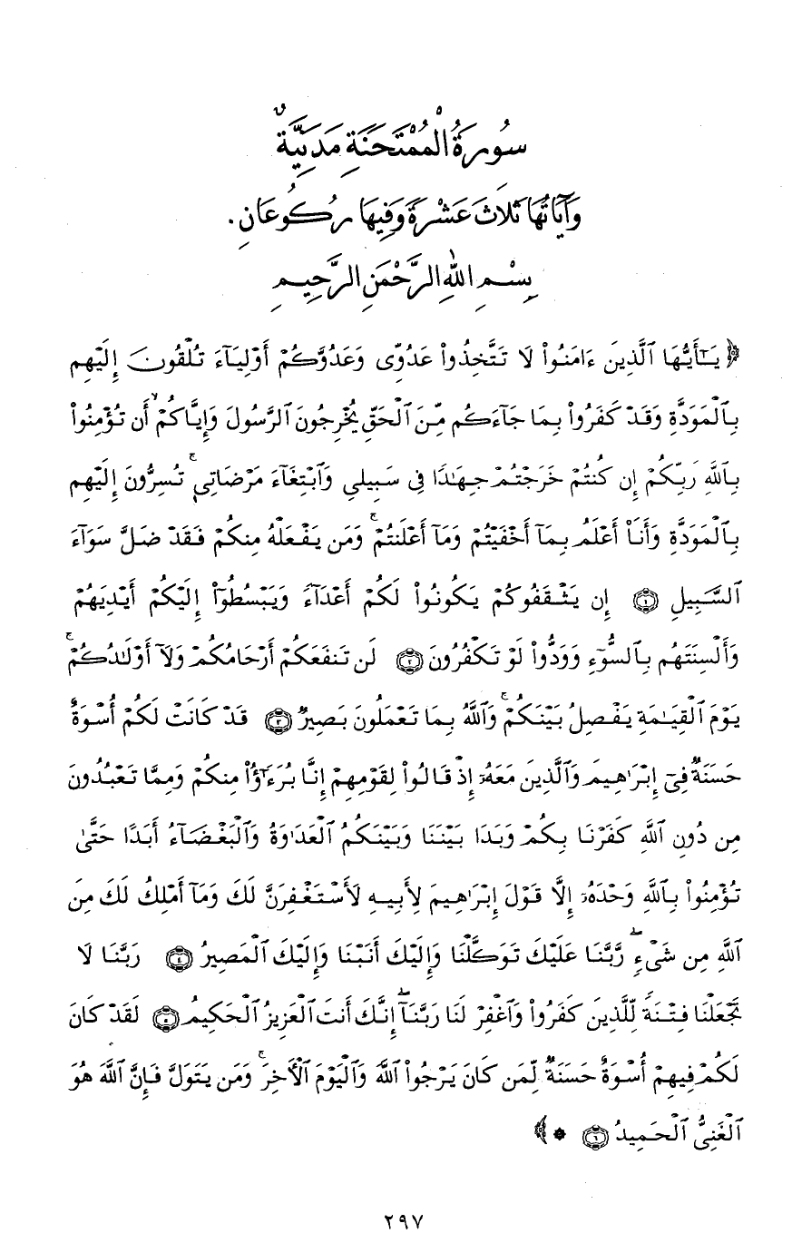 (يَا أَيُّهَا الَّذِينَ آمَنُوا لَا تَتَّخِذُوا عَدُوِّي وَعَدُوَّكُمْ أَوْلِيَاءَ تُلْقُونَ إِلَيْهِمْ بِالْمَوَدَّةِ وَقَدْ كَفَرُوا بِمَا جَاءَكُمْ مِنَ الْحَقِّ يُخْرِجُونَ الرَّسُولَ وَإِيَّاكُمْ أَنْ تُؤْمِنُوا بِاللهِ رَبِّكُمْ إِنْ كُنْتُمْ خَرَجْتُمْ جِهَادًا فِي سَبِيلِي وَابْتِغَاءَ مَرْضَاتِي تُسِرُّونَ إِلَيْهِمْ بِالْمَوَدَّةِ وَأَنَا أَعْلَمُ بِمَا أَخْفَيْتُمْ وَمَا أَعْلَنْتُمْ وَمَنْ يَفْعَلْهُ مِنْكُمْ فَقَدْ ضَلَّ سَوَاءَ السَّبِيلِ (1) إِنْ يَثْقَفُوكُمْ يَكُونُوا لَكُمْ أَعْدَاءً وَيَبْسُطُوا إِلَيْكُمْ أَيْدِيَهُمْ وَأَلْسِنَتَهُمْ بِالسُّوءِ وَوَدُّوا لَوْ تَكْفُرُونَ (2) لَنْ تَنْفَعَكُمْ أَرْحَامُكُمْ وَلَا أَوْلَادُكُمْ يَوْمَ الْقِيَامَةِ يَفْصِلُ بَيْنَكُمْ وَاللهُ بِمَا تَعْمَلُونَ بَصِيرٌ (3) قَدْ كَانَتْ لَكُمْ أُسْوَةٌ حَسَنَةٌ فِي إِبْرَاهِيمَ وَالَّذِينَ مَعَهُ إِذْ قَالُوا لِقَوْمِهِمْ إِنَّا بُرَءَاءُ مِنْكُمْ وَمِمَّا تَعْبُدُونَ مِنْ دُونِ اللهِ كَفَرْنَا بِكُمْ وَبَدَا بَيْنَنَا وَبَيْنَكُمُ الْعَدَاوَةُ وَالْبَغْضَاءُ أَبَدًا حَتَّى تُؤْمِنُوا بِاللهِ وَحْدَهُ إِلَّا قَوْلَ إِبْرَاهِيمَ لِأَبِيهِ لَأَسْتَغْفِرَنَّ لَكَ وَمَا أَمْلِكُ لَكَ مِنَ اللهِ مِنْ شَيْءٍ رَبَّنَا عَلَيْكَ تَوَكَّلْنَا وَإِلَيْكَ أَنَبْنَا وَإِلَيْكَ الْمَصِيرُ (4) رَبَّنَا لَا تَجْعَلْنَا فِتْنَةً لِلَّذِينَ كَفَرُوا وَاغْفِرْ لَنَا رَبَّنَا إِنَّكَ أَنْتَ الْعَزِيزُ الْحَكِيمُ (5) لَقَدْ كَانَ لَكُمْ فِيهِمْ أُسْوَةٌ حَسَنَةٌ لِمَنْ كَانَ يَرْجُو اللهَ وَالْيَوْمَ الْآخِرَ وَمَنْ يَتَوَلَّ فَإِنَّ اللهَ هُوَ الْغَنِيُّ الْحَمِيدُ (6)